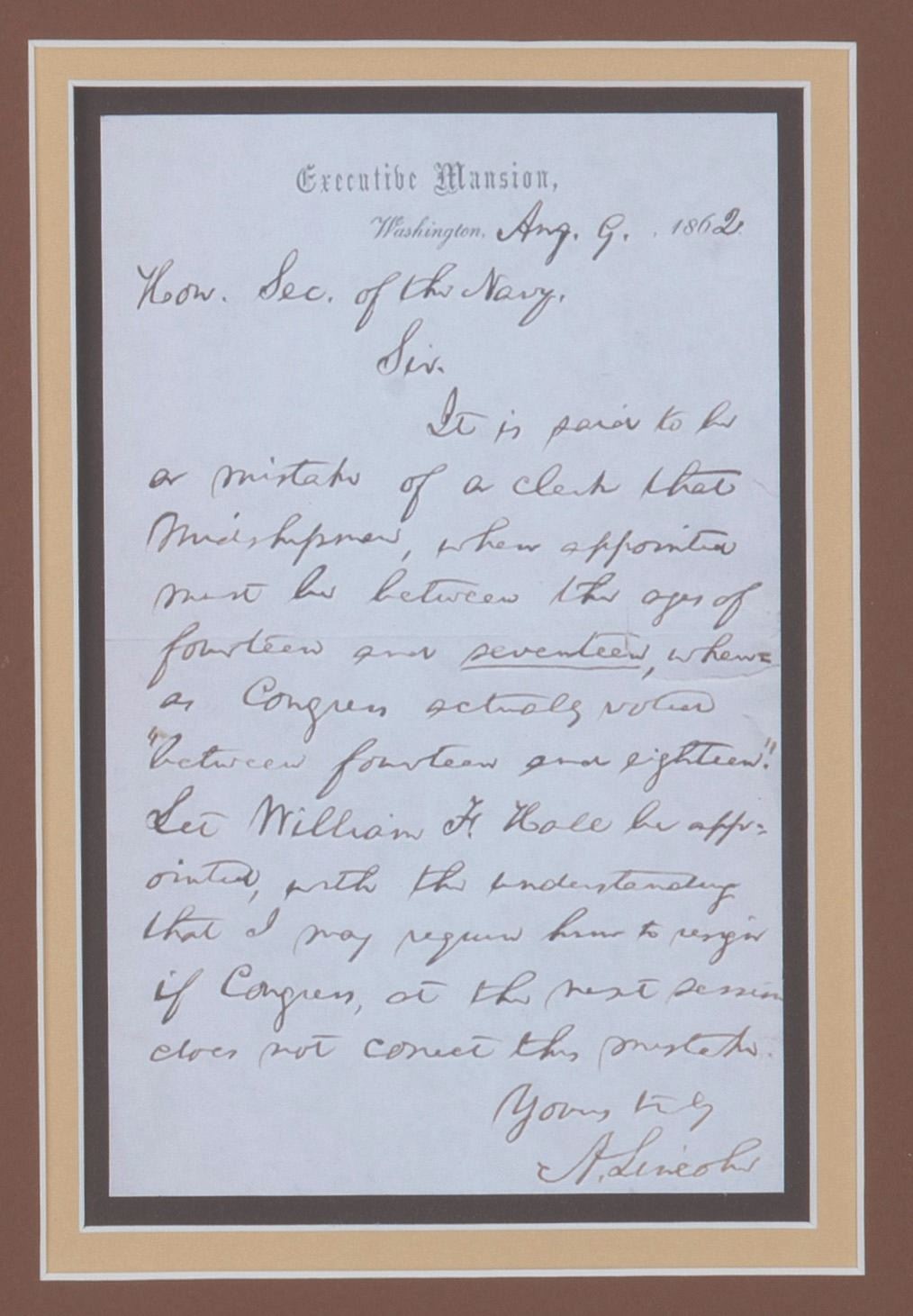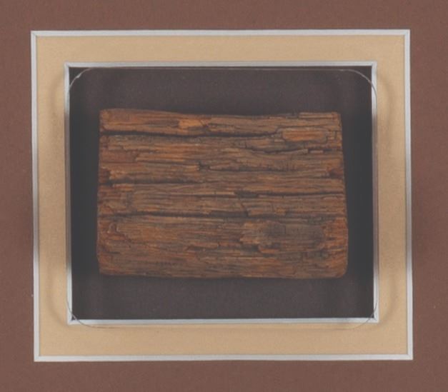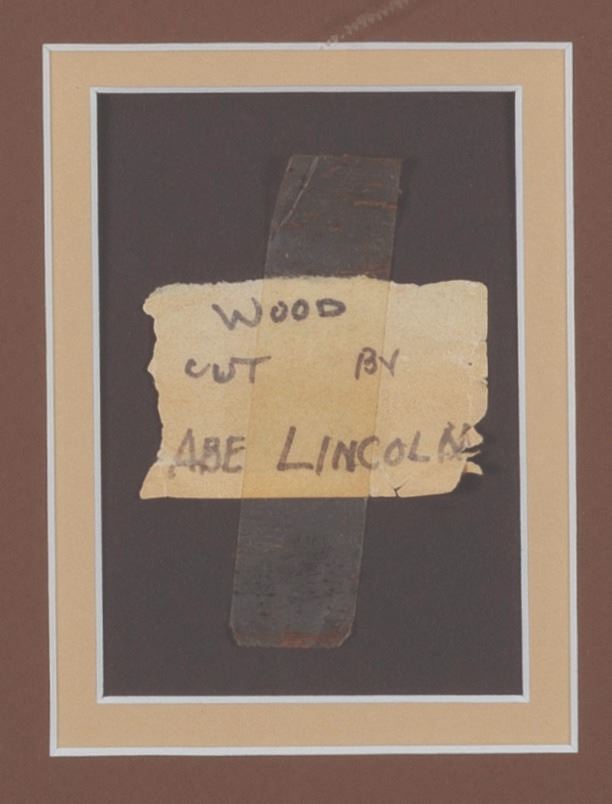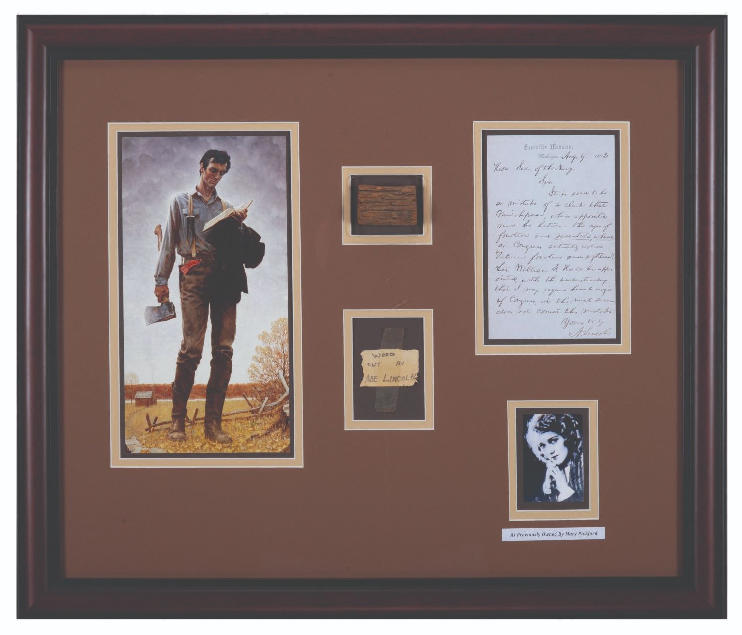 (Mary Pickford / Abraham Lincoln, 1830s-1930s) A piece of wood labeled as having been cut by Abe Lincoln, from the estate of actress Mary Pickford. In 1830, Thomas Lincoln brought his family, including 21-year- old Abraham, to Macon County Illinois, to live near his cousin Dennis F. Hanks. Dennis and his son John helped Thomas and Abraham build a 16'x16' log cabin. It is a matter of record that the Hanks family sold pieces of wood from that cabin during Abraham's 1860 Presidential campaign. Samples of this wood viewable online appear of the same cut and character as this piece. This piece of wood was found in the estate of actress Mary Pickford, with the"Wood Cut By Abe Lincoln" label and tape displayed here attached. While we cannot confirm this wood's origin, it does appear in all aspects to match the artifacts known as Lincoln cut wood, and certainly to have been accepted by Mary Pickford as such. Measuring 2"x1.5"x1", the wood appears in very good condition, expertly displayed within a 20.75"x24.75" framed piece alongside the label, images of Pickford and Lincoln, and a reproduction of a letter written by Lincoln.