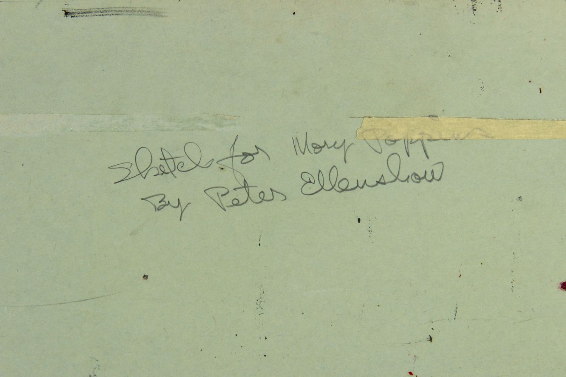 (Disney, c.1963) An original painting by artist Peter Ellenshaw for Walt Disney's "Mary Poppins". Depicting the bankers of Fidelity Fiduciary Bank, this original painting is accomplished in gouache on art board. The painting comes with a letter of authenticity from Jim Schaeffing, who worked as an artist on Mary Poppins alongside Ellenshaw and was given this painting by Director Bob Stevenson. Measuring 12"x20", the painting is in good condition with some paint wear from age, including some thin cracks in areas throughout the paint and some edge-wear. A note written on the back side in pencil reads "Sketch for Mary Poppins by Peter Ellenshaw".