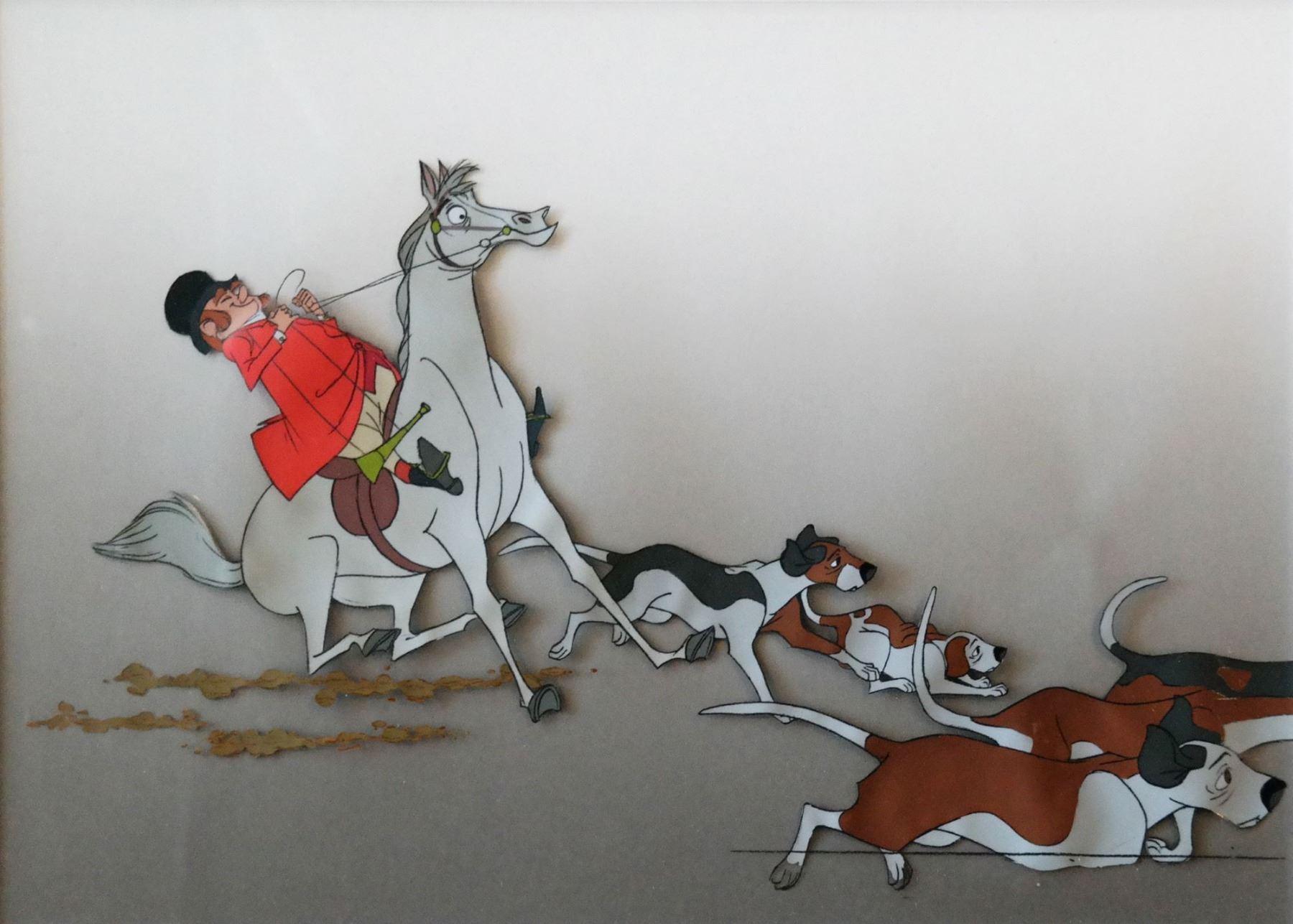 (Disney, 1964) An original production cel from the fox hunting scene in the “Jolly Holiday” sequence. The hand-painted cel is placed over a grey reproduction background for display, and has an image size of 11"x15.5" within its 20"x24" frame. The cel has not been examined out of frame, but appears to be in very good condition with minor wear to the frame from previous display.