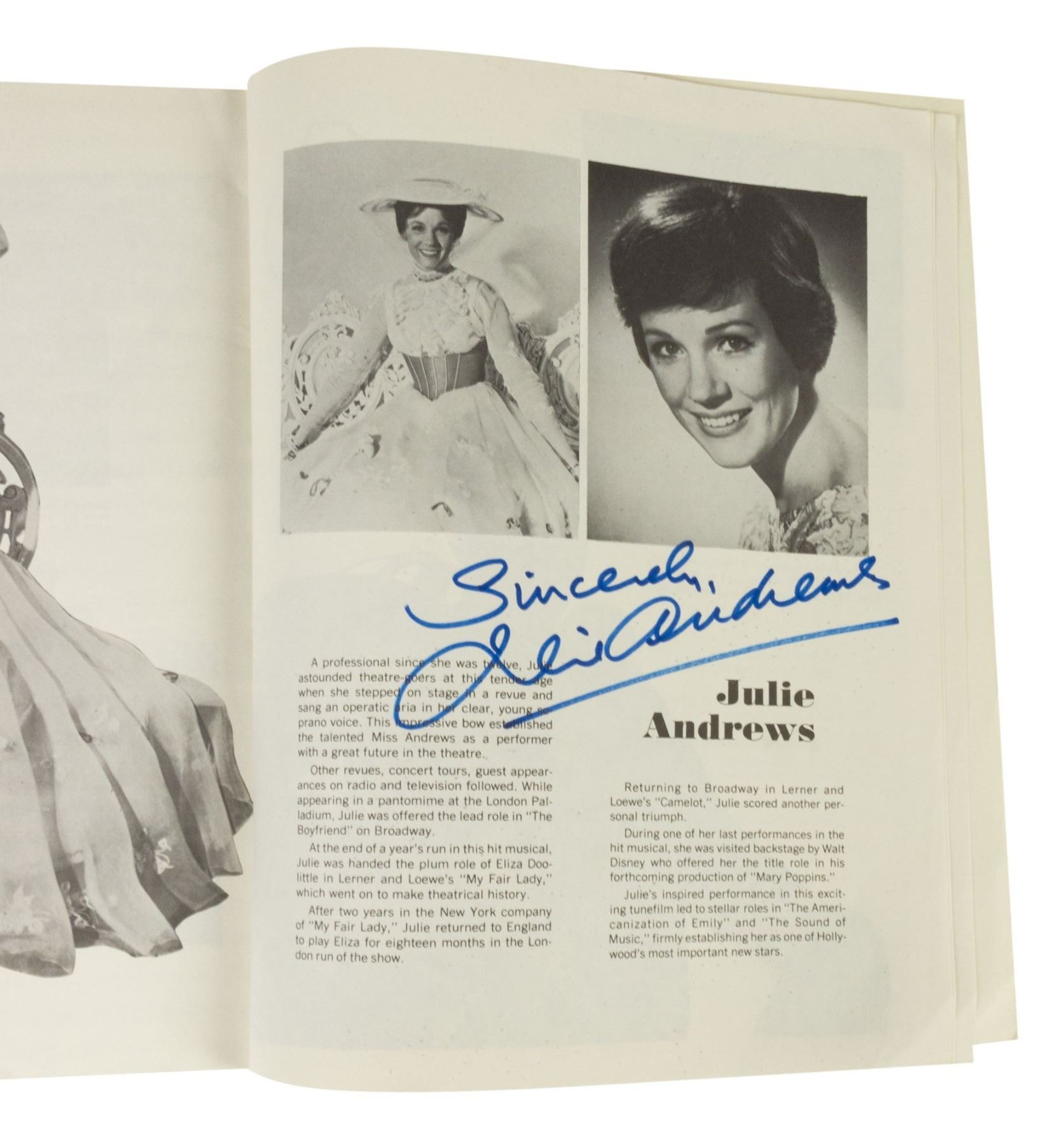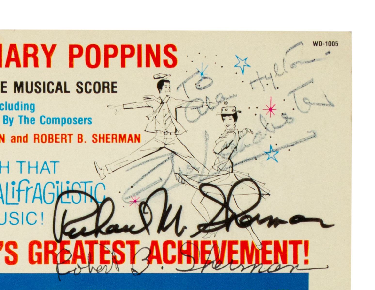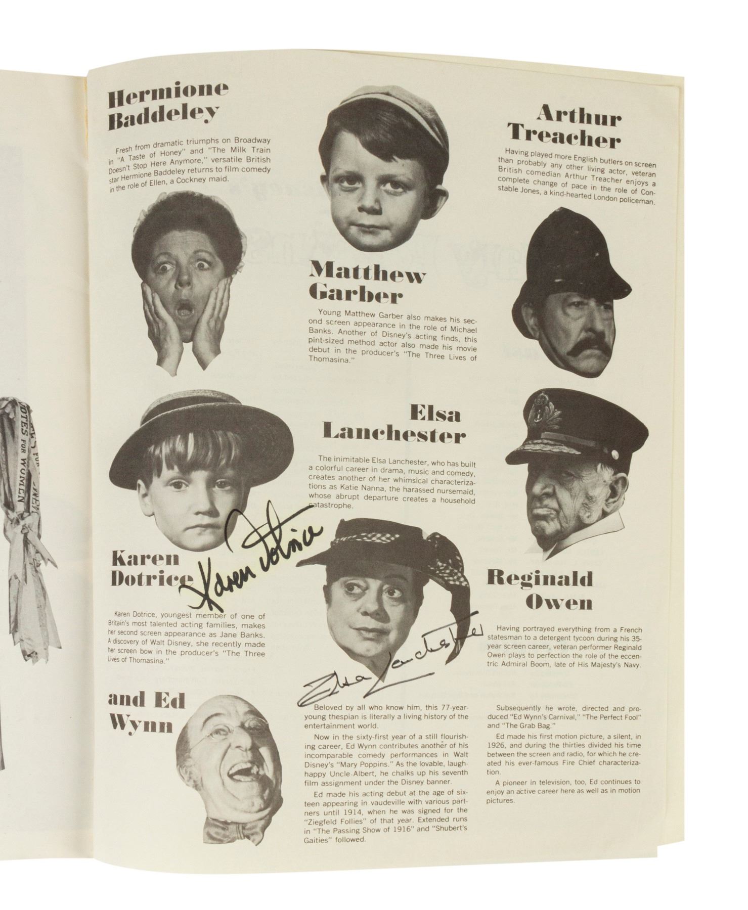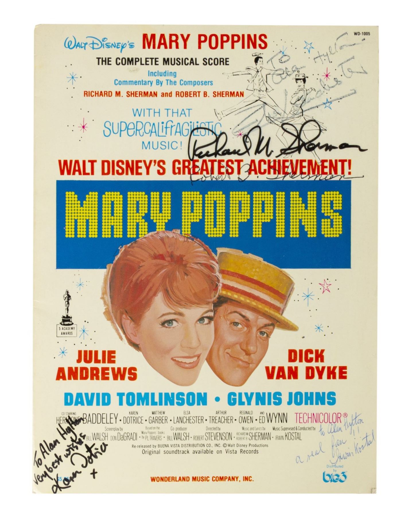 (Walt Disney Studios, 1979) A multi-signed book containing the complete musical score to Walt Disney's Mary Poppins. This book is signed by (6) members of the film's cast and crew including: Julie Andrews, Richard Sherman, Robert Sherman, Karen Dotrice, Irwin Kostal, and Elsa Lanchester. The book measures 12"x9" and is in fair to good condition with some edge-wear from use and some fading to Lanchester's signature on the cover.