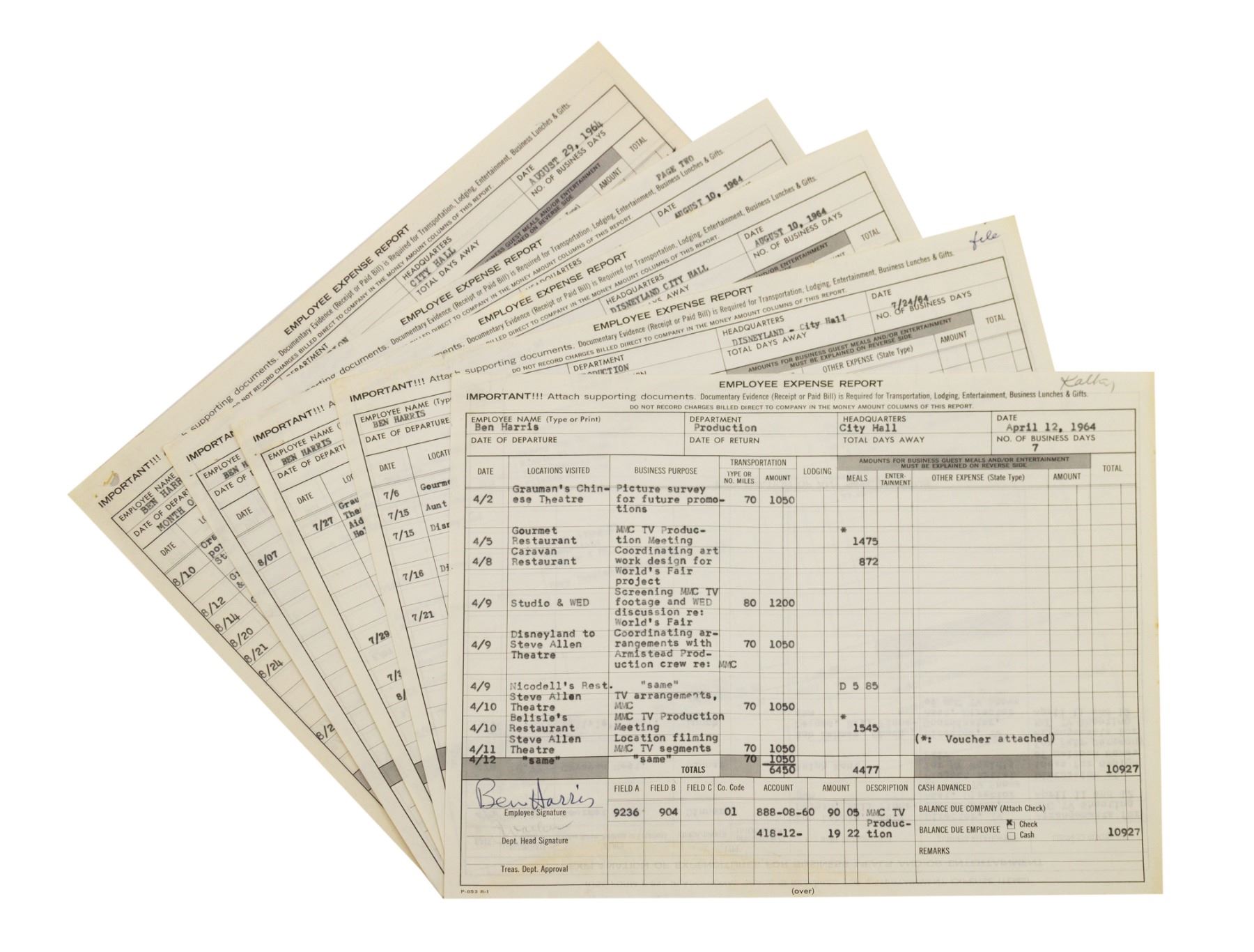 (Disney, 1964) A collection of (6) double-sided expense report pages (all but 2-pages have content on the front and back) submitted by a member of the Mary Poppins production team for expenditures related to preparations for the film's world premiere at Grauman's Chinese Theater on Thursday, August 27, 1964. The original typed carbon pages are all signed by employee Ben Harris and co-signed by a department head. Dated between "4/2" and "8/27," 1964, the charges chronicled include surveys of the theater site, Mickey Mouse Club related meetings, and repeated trips to Grauman's and surrounding restaurants to plan the event. Perhaps the most interesting charge is dated 8/27 and totals $8.21 for "Refreshment for Walt Disney." One wonders what Walt ordered that day from Del's Coffee Shop to fortify himself for the dog and pony show of a major Hollywood premiere. Measuring 8.5"x11," the reports are in very good condition with some breached staple holes, light edge toning, and edge wear.
