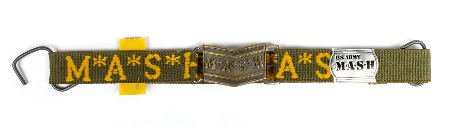 (CBS, c.1970s) A very rare vintage belt created to promote the popular television show "Mash". This belt was original purchased from Toys 'r' Us and still retains the original sales sticker and metal hanger. The belt measures 13" long on the hanger and is in very fine unused condition.