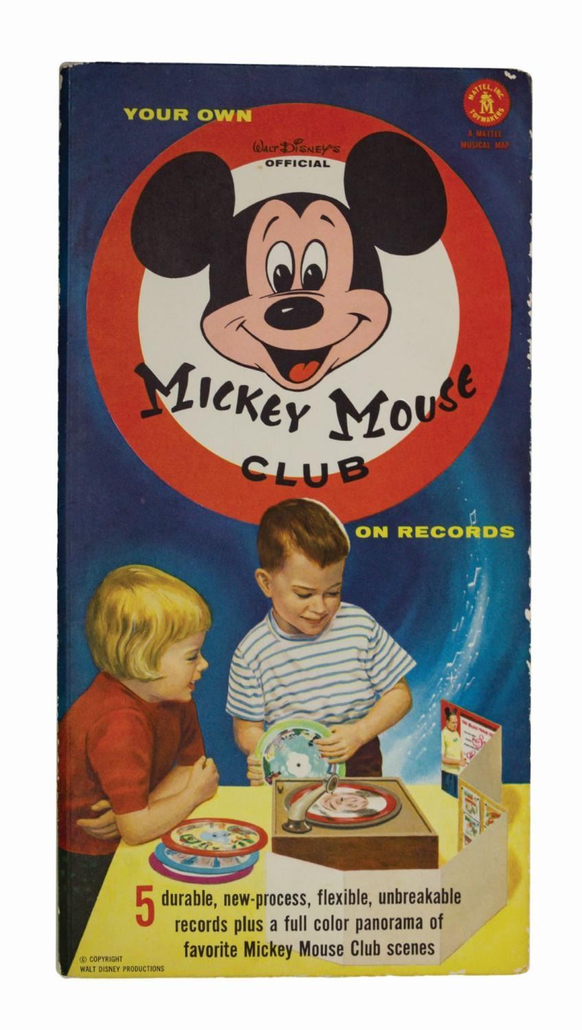 (Mattel, c.1955) A vintage Mickey Mouse Club Musical Map manufactured by Mattel. The fold-out map features illustrated scenes from the Mickey Mouse Club television show at the top, with a set of (5) punch-out 78-rpm records corresponding to the images. The records have not been removed and the map is intact. The original envelope is included. Measuring 14.5"x7.5", the piece is in very good condition. The adhesive securing the protective plastic covering over the records has discolored with age and the map has faintly browned. The envelope exhibits some surface loss to the edges and reverse, spidering along the folds, creases to the interior flaps, and light tan toning to the white elements.