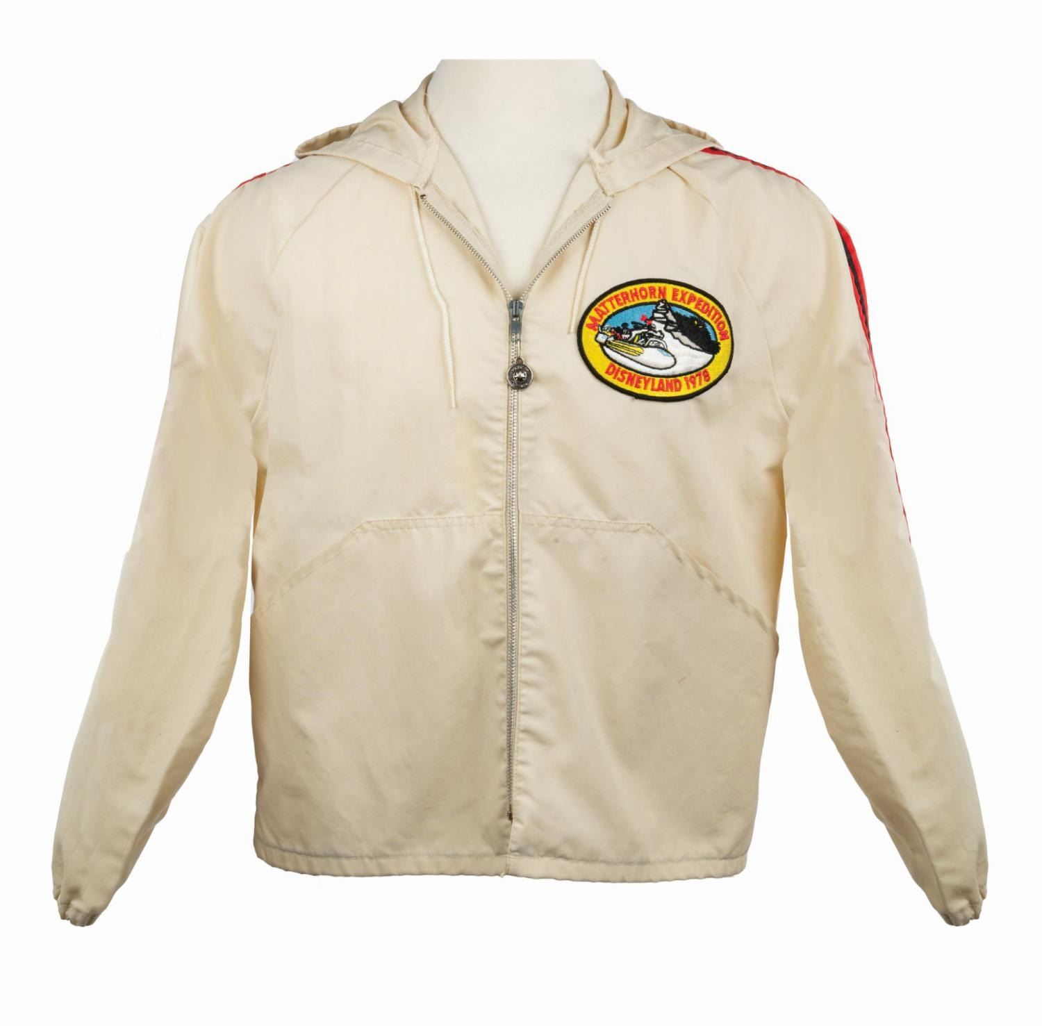 (Disneyland, 1978) A Matterhorn Windbreaker produced for the Matterhorn Expedition at Disneyland in 1978. The Large size lightweight Weather Tamer windbreaker was manufactured exclusively for Cast Members, and commemorates the re-opening of the Matterhorn in 1978, with and embroidered chest patch. The vintage 1970s garment features two deep panel pockets, elastic cuffs, an adjustable hood, lower drawstring, zipper with slider bearing the official Weather Tamer insignia, and exhibits in good used condition with only a few small light discolorations.