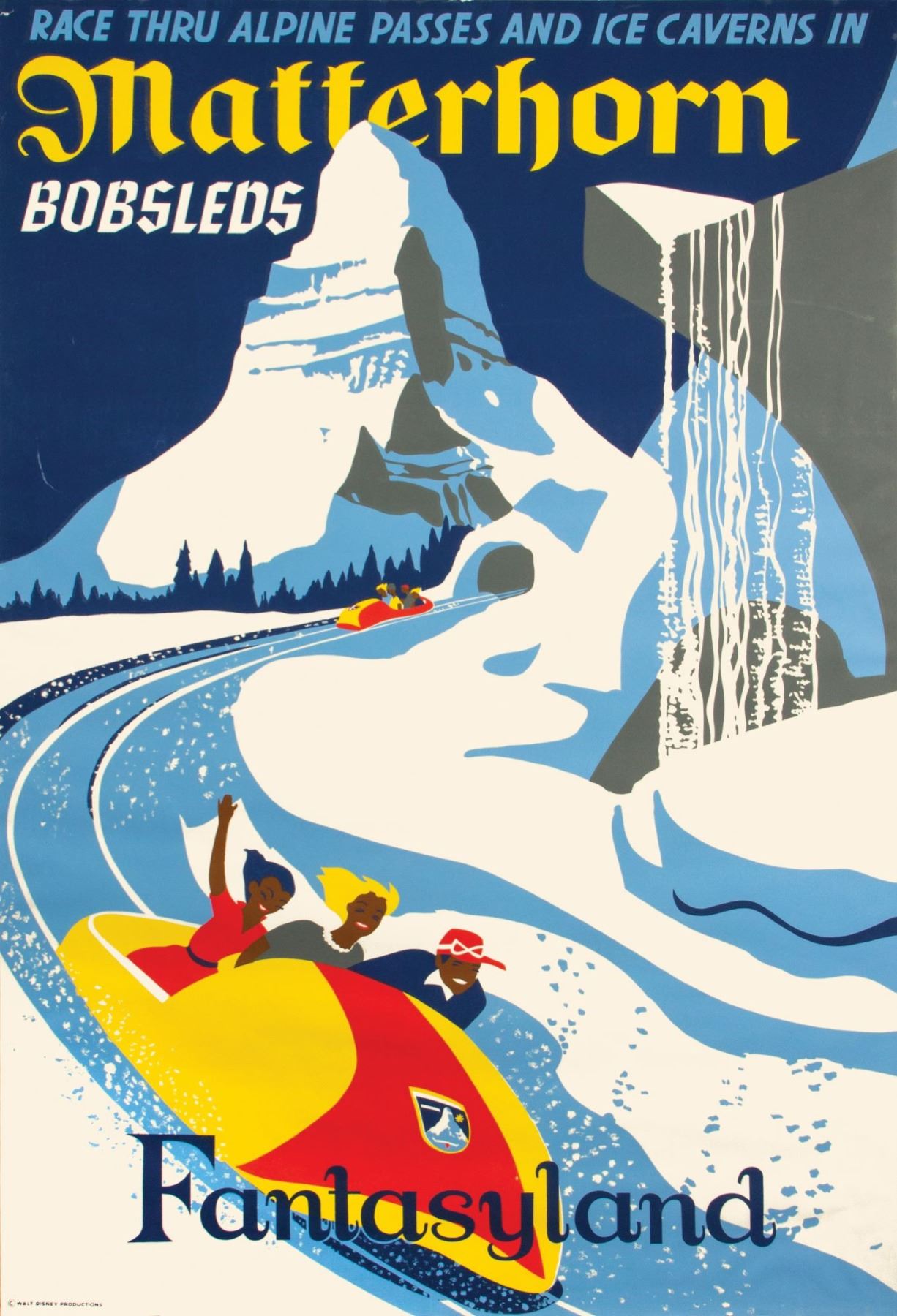 (Disneyland, 1959) A hand-silkscreened attraction poster for Disneyland's "Matterhorn Bobsleds". Designed by Paul Hartley, the great sense of movement and color choices used in this poster have made it a favorite among collectors since the attraction opened in 1959. The poster measures 54"x36" and is in good condition with spots of minor wear throughout. This poster is adhered to a foam core backing, with a thin portion of the right-edge of the poster curling over the backing.