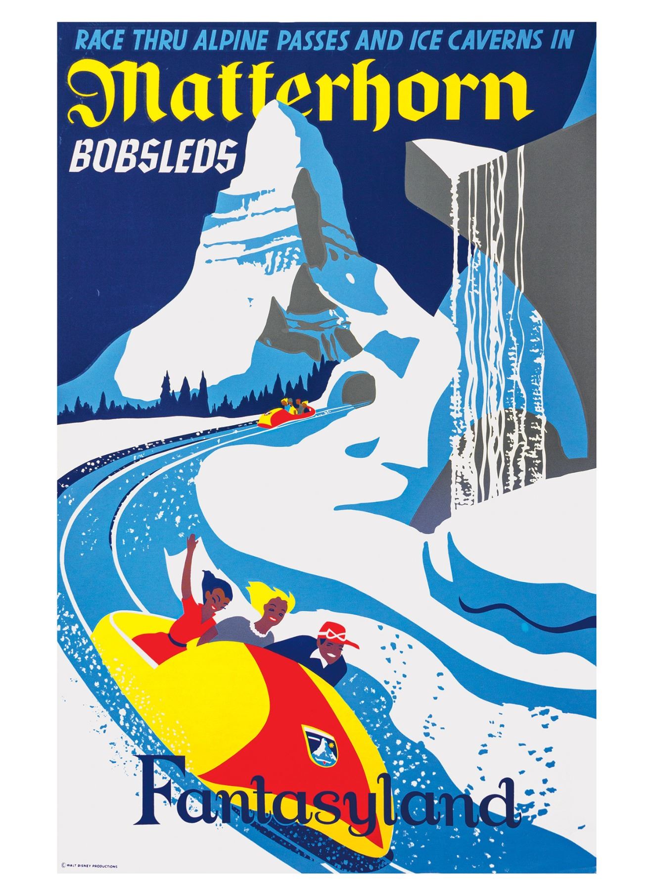(Disneyland, 1959) A hand-silkscreened attraction poster for Disneyland's Matterhorn Bobsleds. Designed by Paul Hartley, the great sense of movement and color choices used in this poster have made it a favorite among park guests and collectors since the attraction first opened in 1959. The poster measures 54"x36" and is in good condition with creases at the edges and minor surface wear.