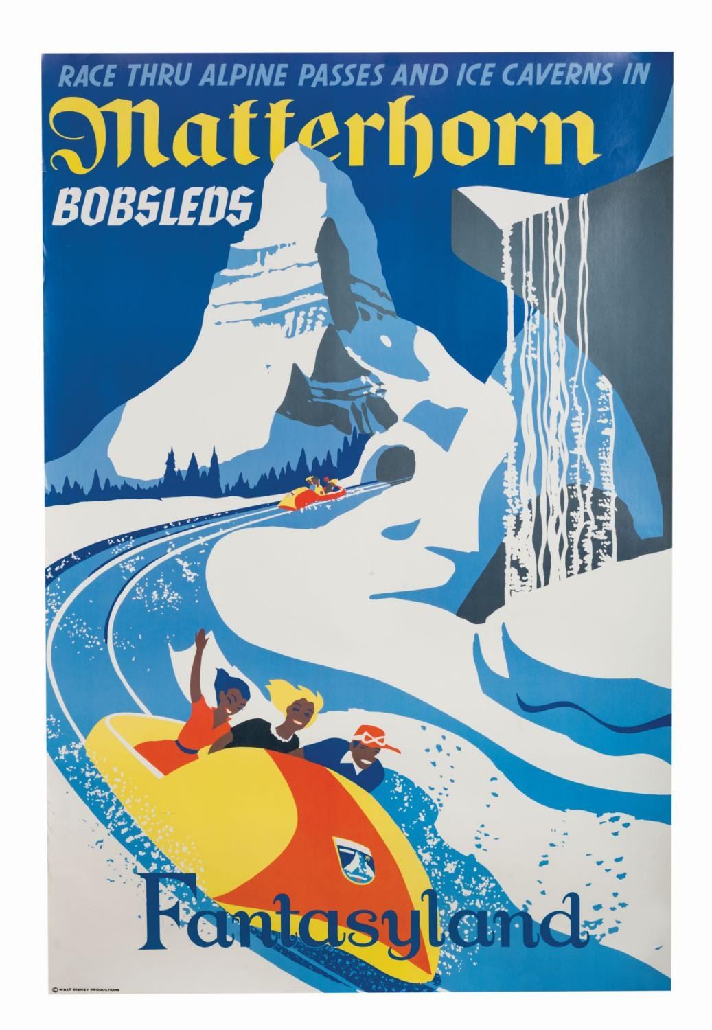 (Disneyland, 1990s) A full-size attraction poster reproduction from the Disney Gallery featuring the Matterhorn Bobsleds. For a very short time, the Disney Gallery offered a limited amount of full-size reproduction attraction posters for many of the well-known Disneyland attractions. This faithful replica, with artwork by Paul Hartley, measures 54"x36" and is in very good condition with some edge-wear, including several small tears and areas of bending.