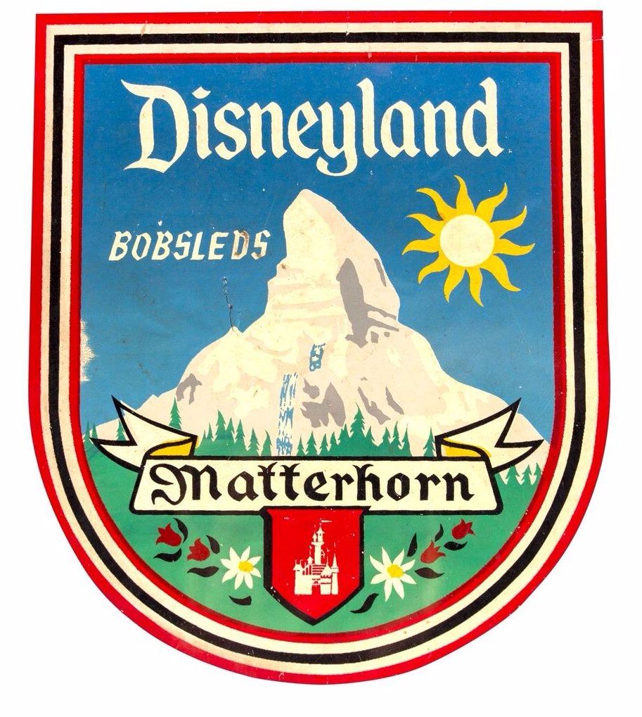 (Disneyland, c.1990s) An original ride vehicle decal for the "Matterhorn Bobsleds" attraction at Disneyland. This logo features a blue gradient sky where earlier versions had a white bar behind the text "Disneyland". This item measures 8.25"x7" and is in fair to good condition with some wear throughout from use including a few very thin tears along the top-edge and one under the "e" in Bobsleds. This decal is placed over a trimmed clear plastic sheet to help preserve the decal.