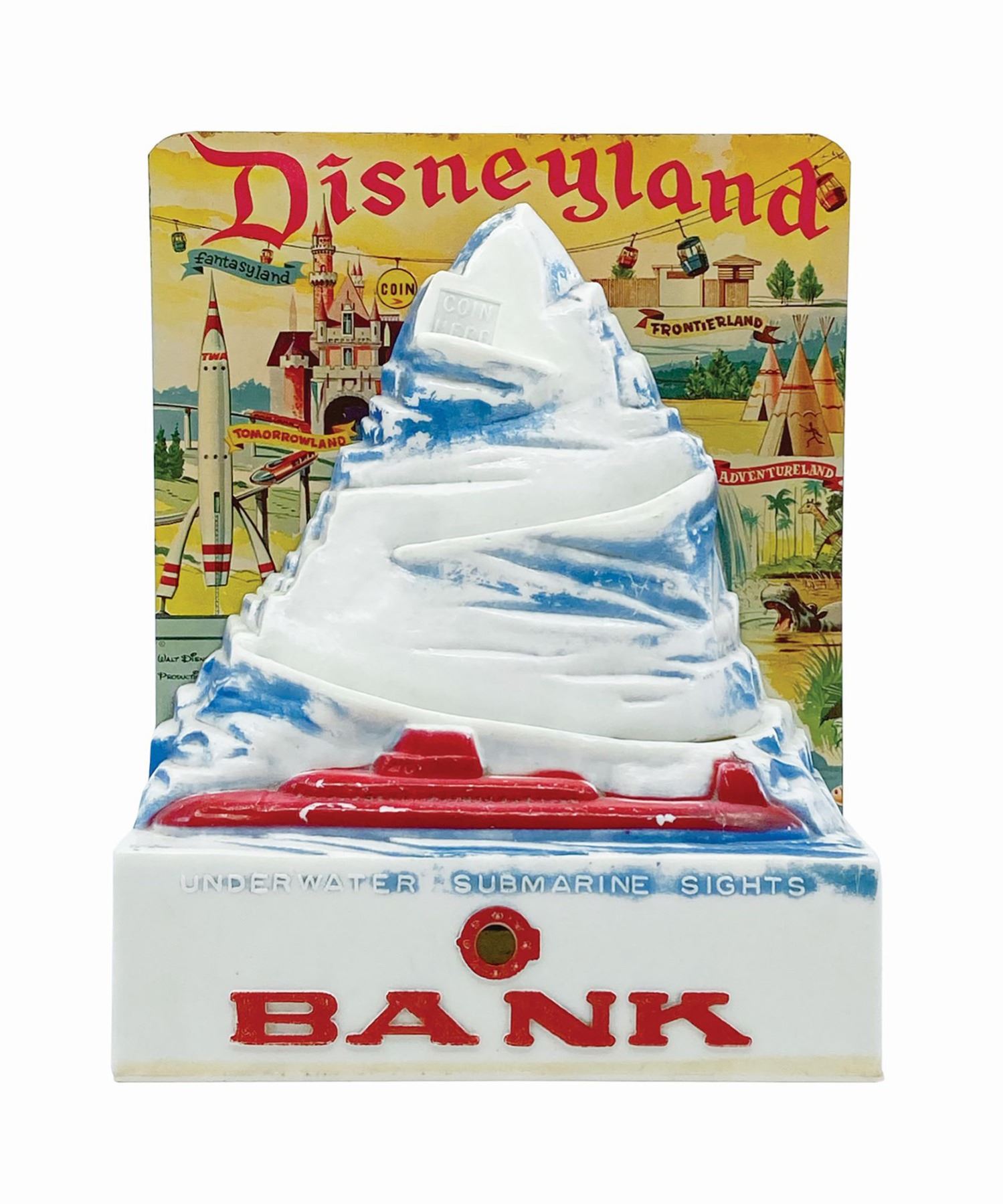 (Disneyland, 1959) A very rare coin bank produced in the opening year of the Matterhorn Bobsleds attraction. Celebrating the newly opened Submarine Voyage as well, the toy's base has a viewer that reveals an underwater rendering of the attraction. This rare early park souvenir is considered by many to be one of the top Disneyland toys of all-time. Measuring 6"x2.5" and 7.5" tall, the bank is in good condition with wear throughout the surface paint on the plastic elements and minor edge wear to the tin and plastic elements.