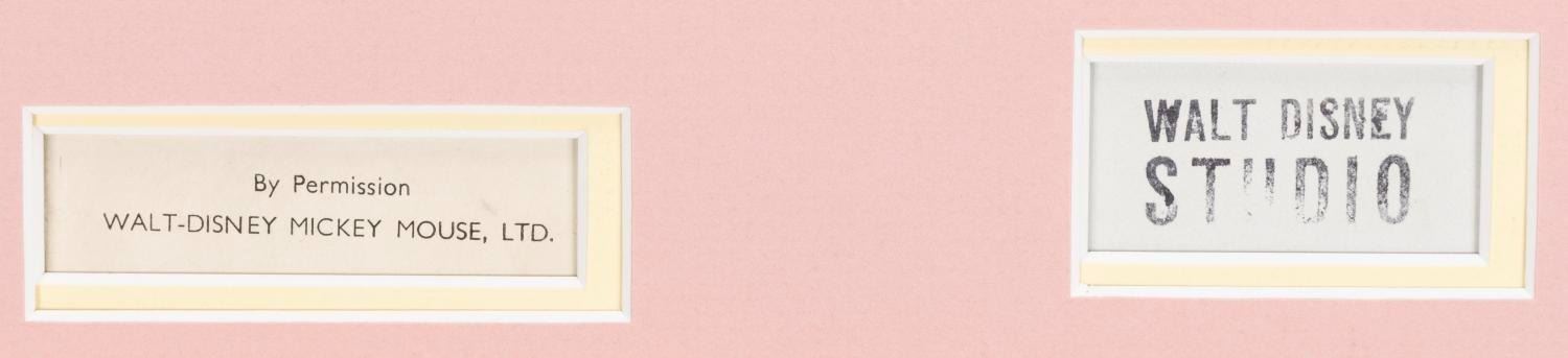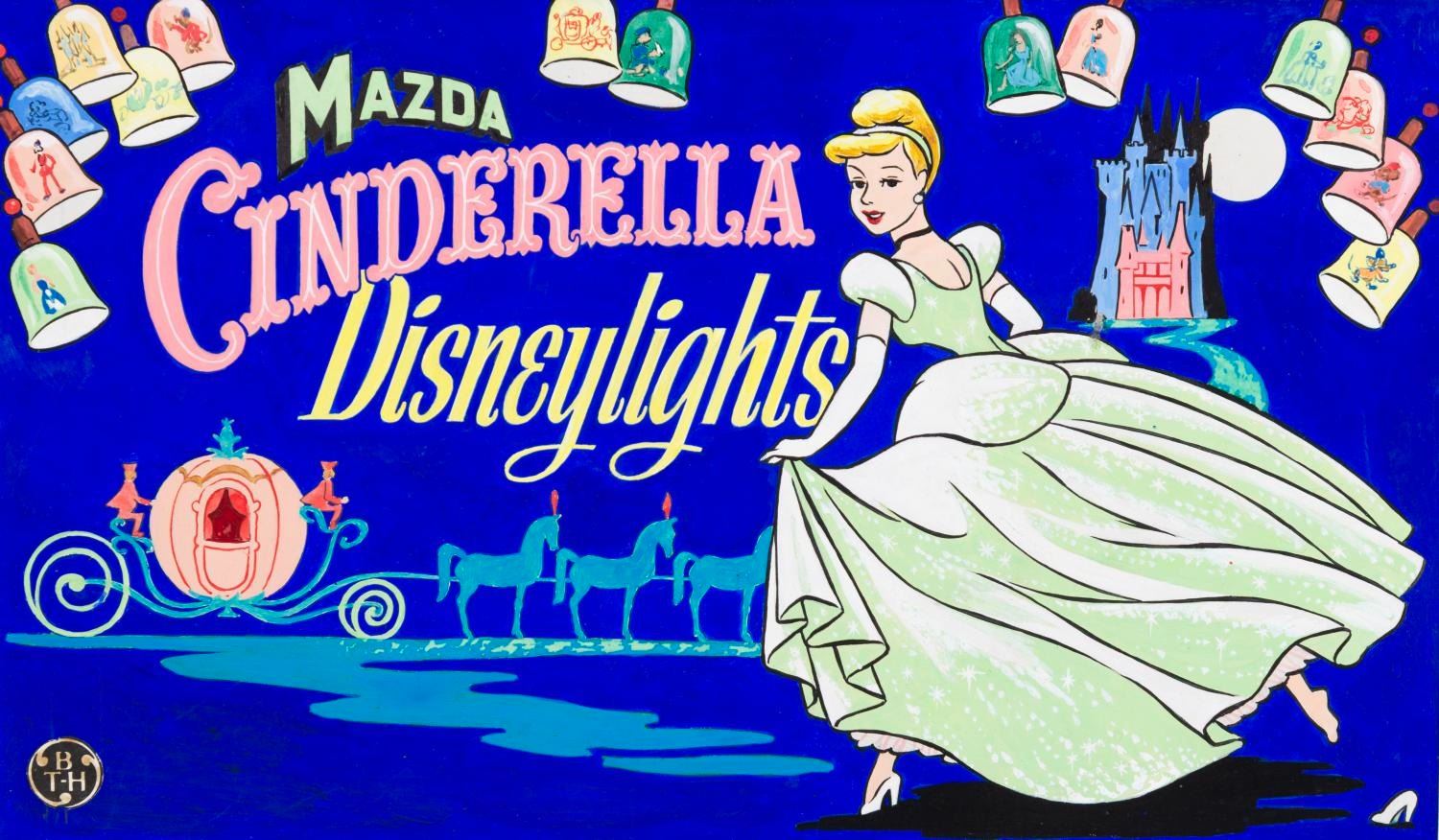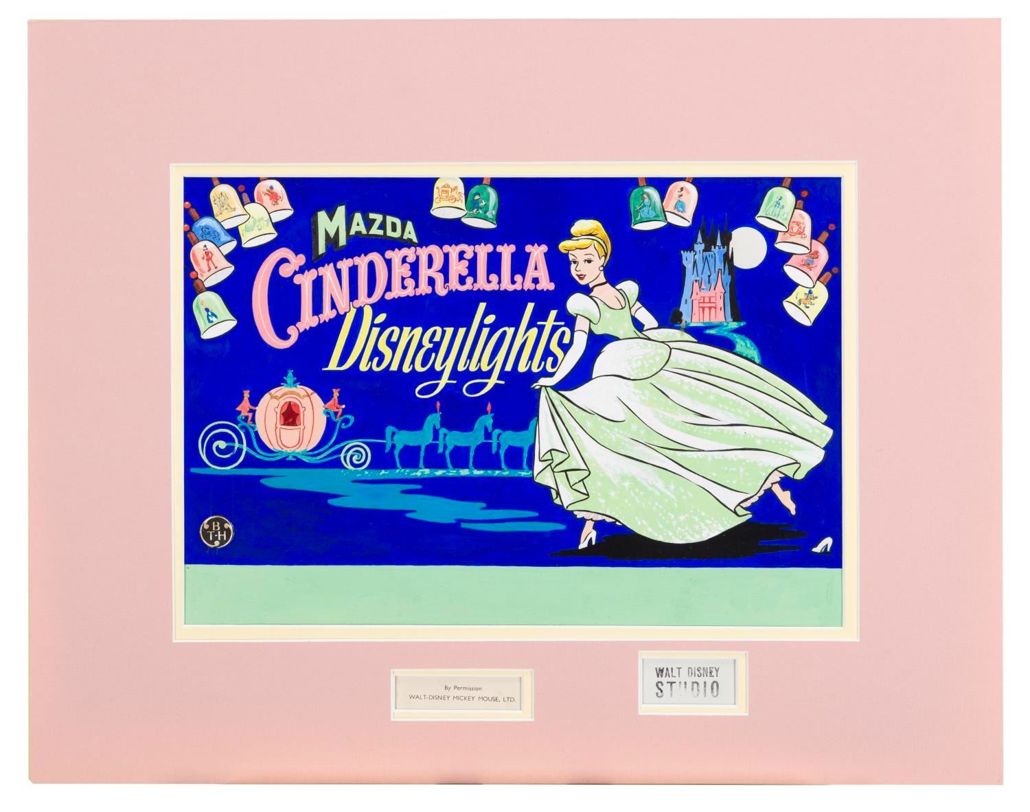 (British Thompson-Houston, 1950) An original painting for the box art of Cinderella-themed Mazda holiday lights. Disney collectors are most familiar with Mazda for their Mickey Mouse and Silly Symphony-themed lights in the 1930s. The Cinderella lights are much scarcer to find. This painting is a fully finished piece, though the actual box produced used art featuring the coach and Mazda name over depicting Cinderella herself. The painting has an image sized 8.5 " x 12.5 " and is in fine condition. It is presented in a 14.5 " x 18.25 " matte with two insets cut to display licensing and Studio stamp on the artboard itself.