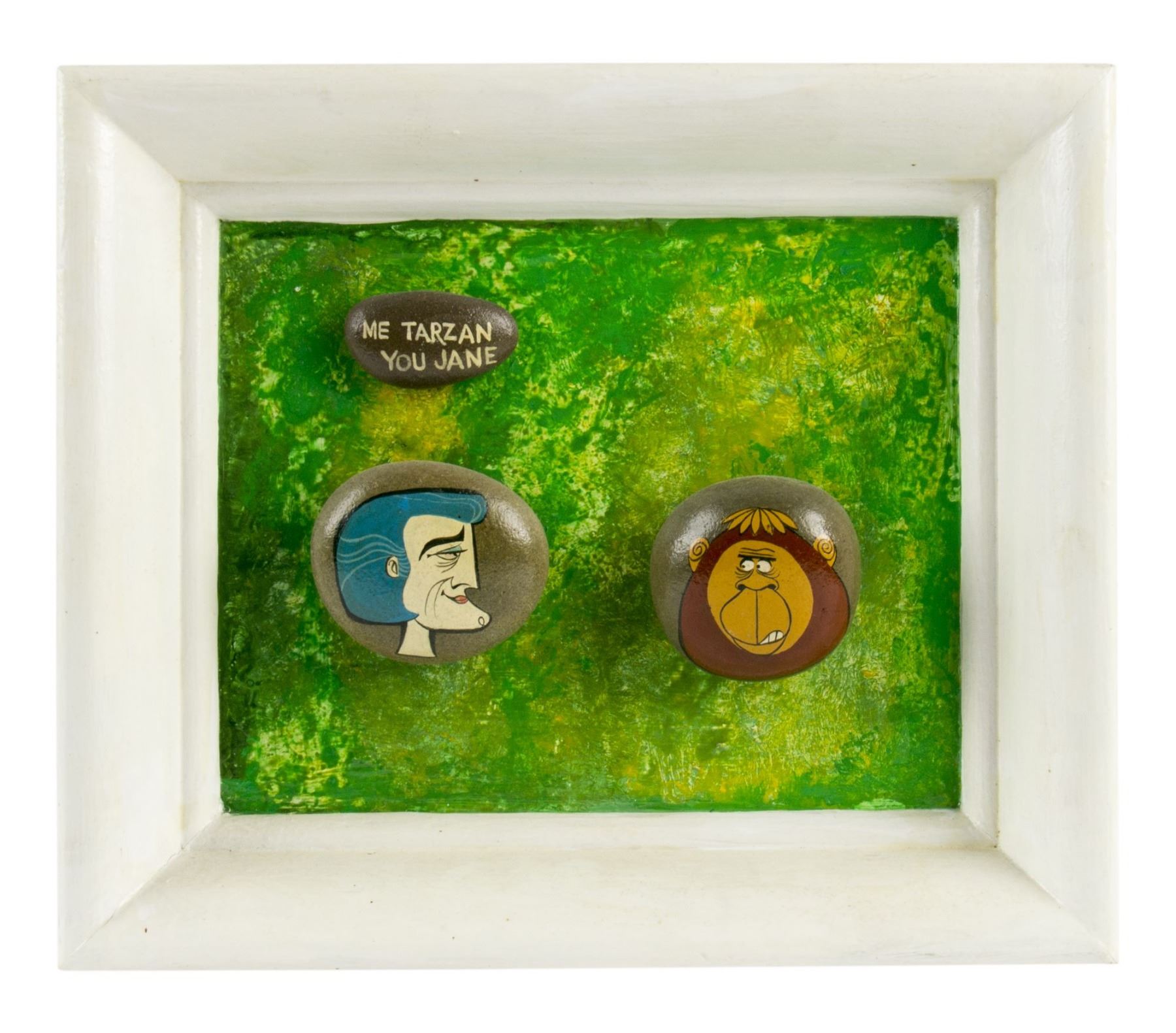 (c.1953) A hand-painted rock display by Rolly Crump depicting a humorous scene that reads "Me tarzan, You Jane". This framed display includes three painted rocks and a painted background. The frame measures 11"x13" and the rocks are in very good condition.