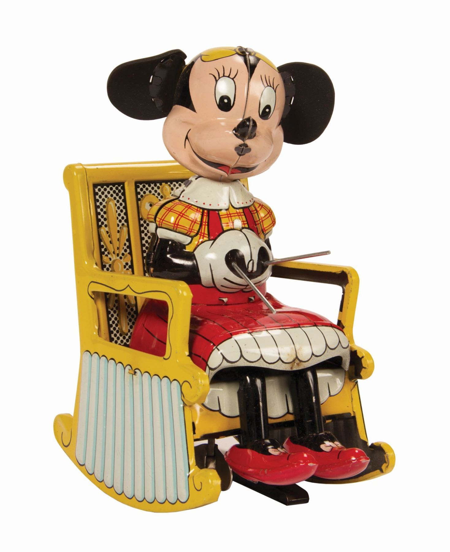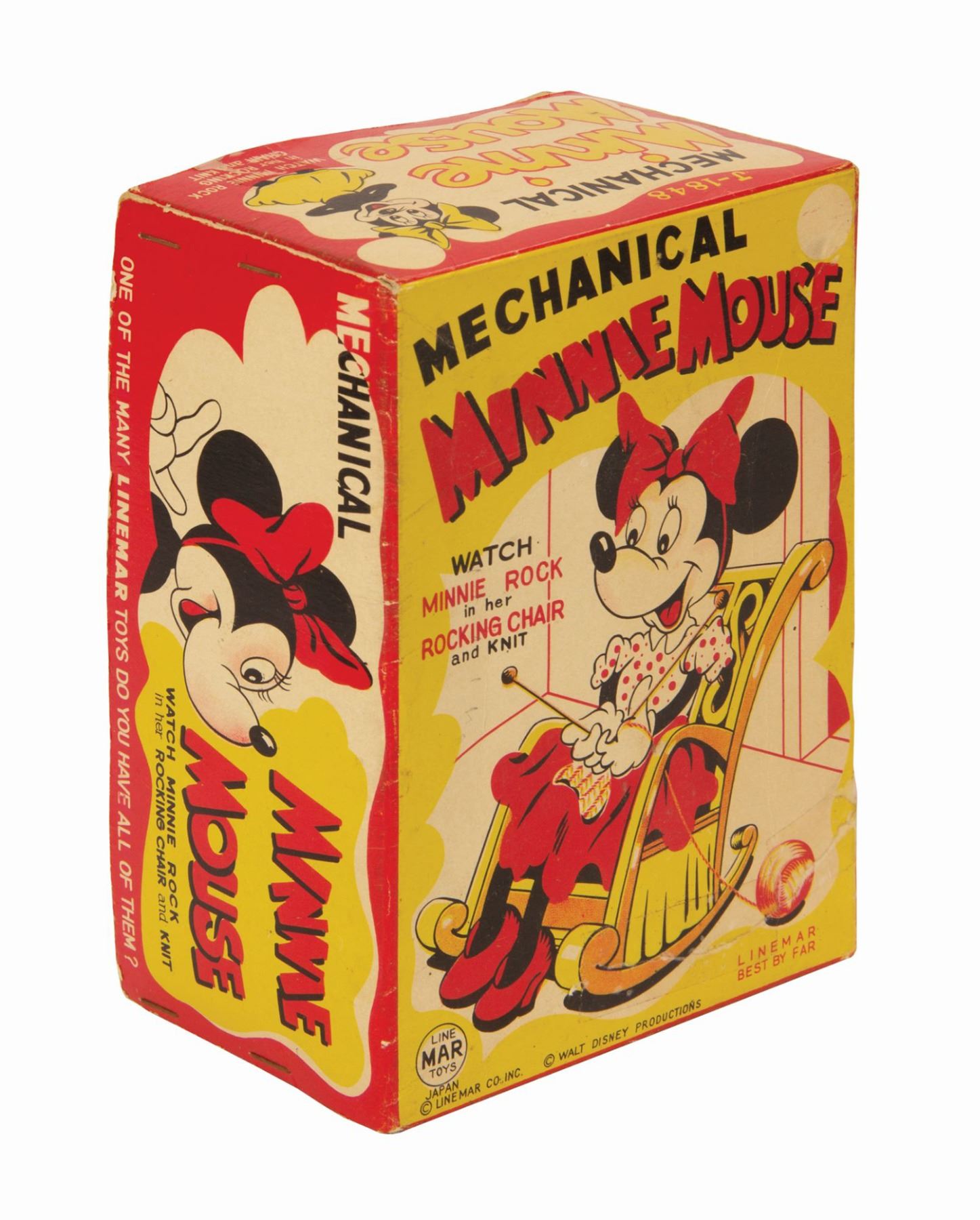 (Disney, c.1950s) A vintage Mechanical Minnie Mouse tin-litho figure with mechanical spring wound action manufactured by LineMar. When the integral winding key on the bottom of the figure is turned, the chair rocks back and forth as Minnie moves her knitting needles up and down. While the chair mechanics can be moved manually, the toy will require servicing for full functionality. Measuring 6.75”x3.5” and 4.5” deep, the piece is in good condition with only minor chips and scuffs. It is accompanied by the original cardboard box, which measures 3.5”x5.25 and 7” long and is in good condition. The box exhibits a tear across the top and side of the lid that has been repaired with transparent tape.