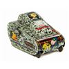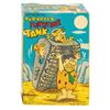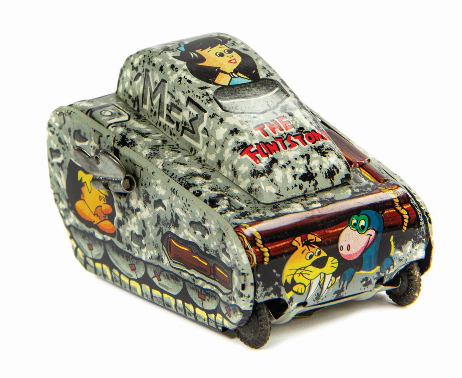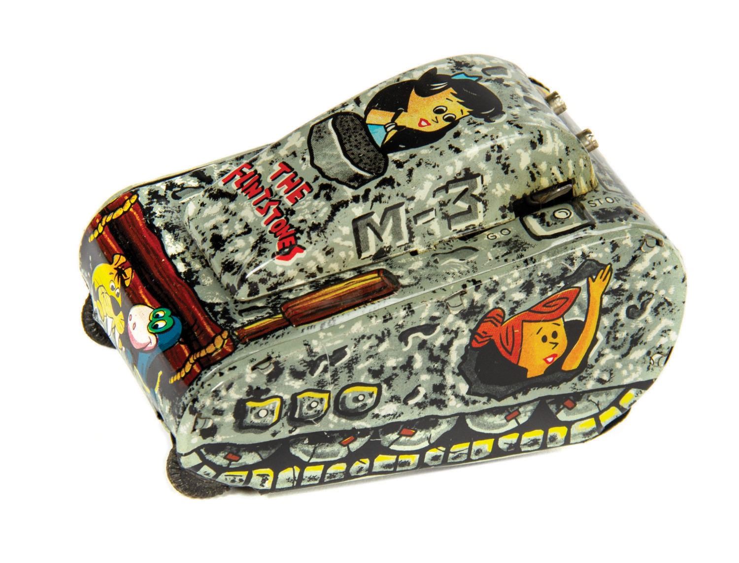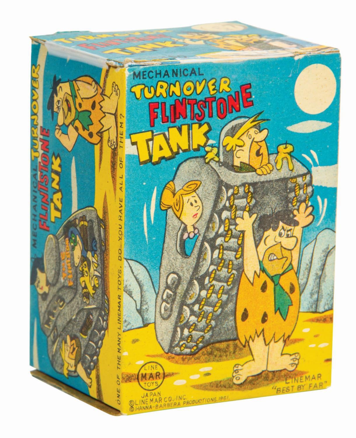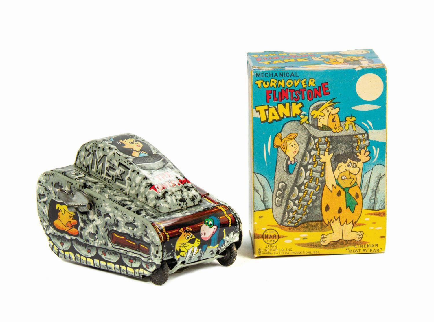 (Linemar, 1961) A wonderful tin toy based on Hanna-Barbera's The Flintstones. Created by Linemar, a subsidiary of Marx Toys, the wind-up tin litho toy features several of the cartoon's characters on the tank, which an angry Fred Flintstone raises up from the bottom. The toy measures just under 4"x2.5" and 2.75" tall and comes in its original box. It is in very fine functioning condition with minor surface wear from use. The box has a few small tears and has been reinforced with tape.