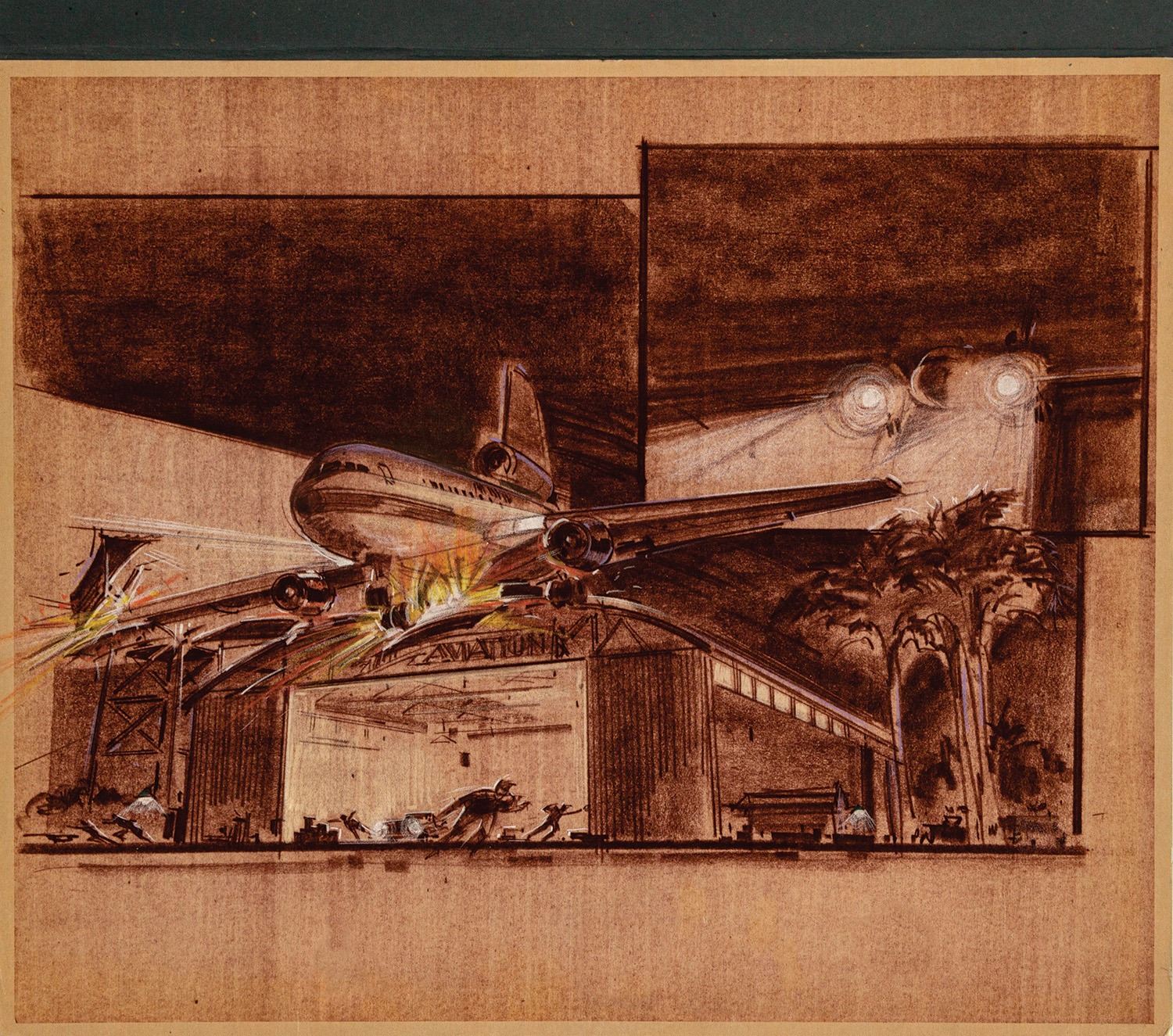 (Landmark Entertainment, c.1988) An original storyboard for Dynamite Nights Stunt Spectacular for Universal Studios. This brownline storyboard is attributed to Chuck Cancilier, and includes hand-colored highlights. While the final show did not include such an elaborate theme, this storyboard captures the spirit of the over-the-top action seen in the live show. Measuring 14.5"x17.5", the foamcore-mounted storyboard is in very good condition with some edge-wear, including spots of peeling at the corners.
