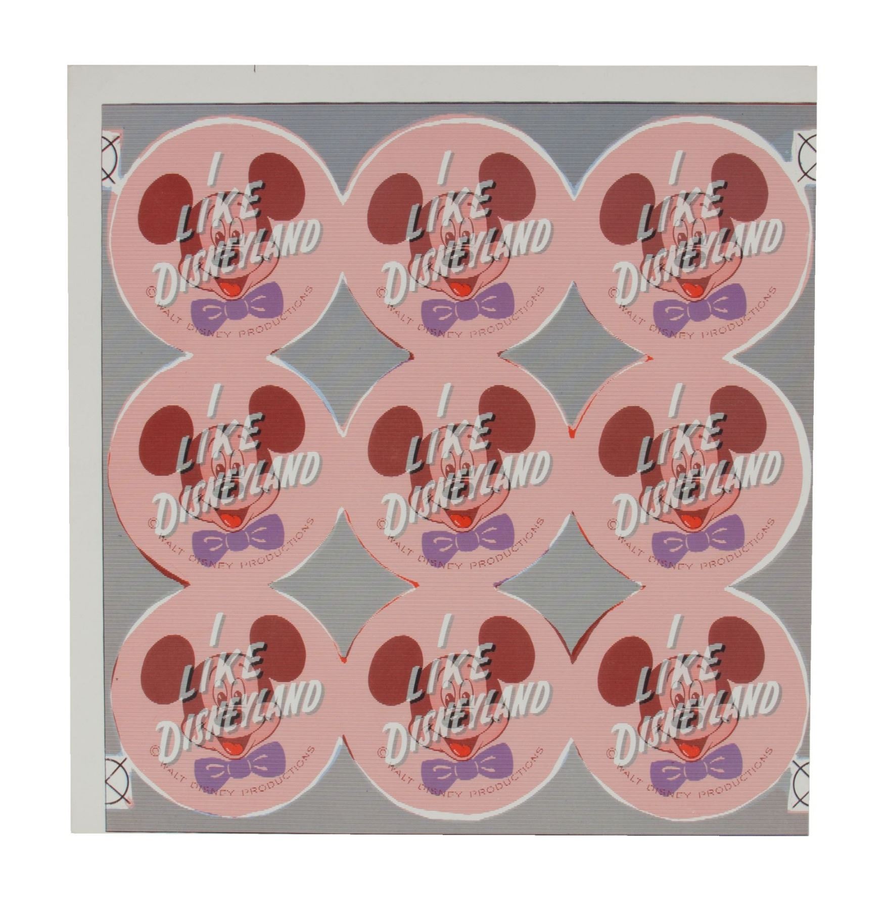 (Disneyland, c.1960s) A very rare skeet of uncut Mickey Mouse "I Like Disneyland" lenticular "flasher buttons". The sheet was created in the production of the popular lenticular button souvenirs that would switch between imagery of popular Disney characters and phrases about Disneyland. This sheet does not change its imagery, but is one step in the creation of the finalized buttons. Measuring 8.75"x8.5", the sheet is in very good condition.