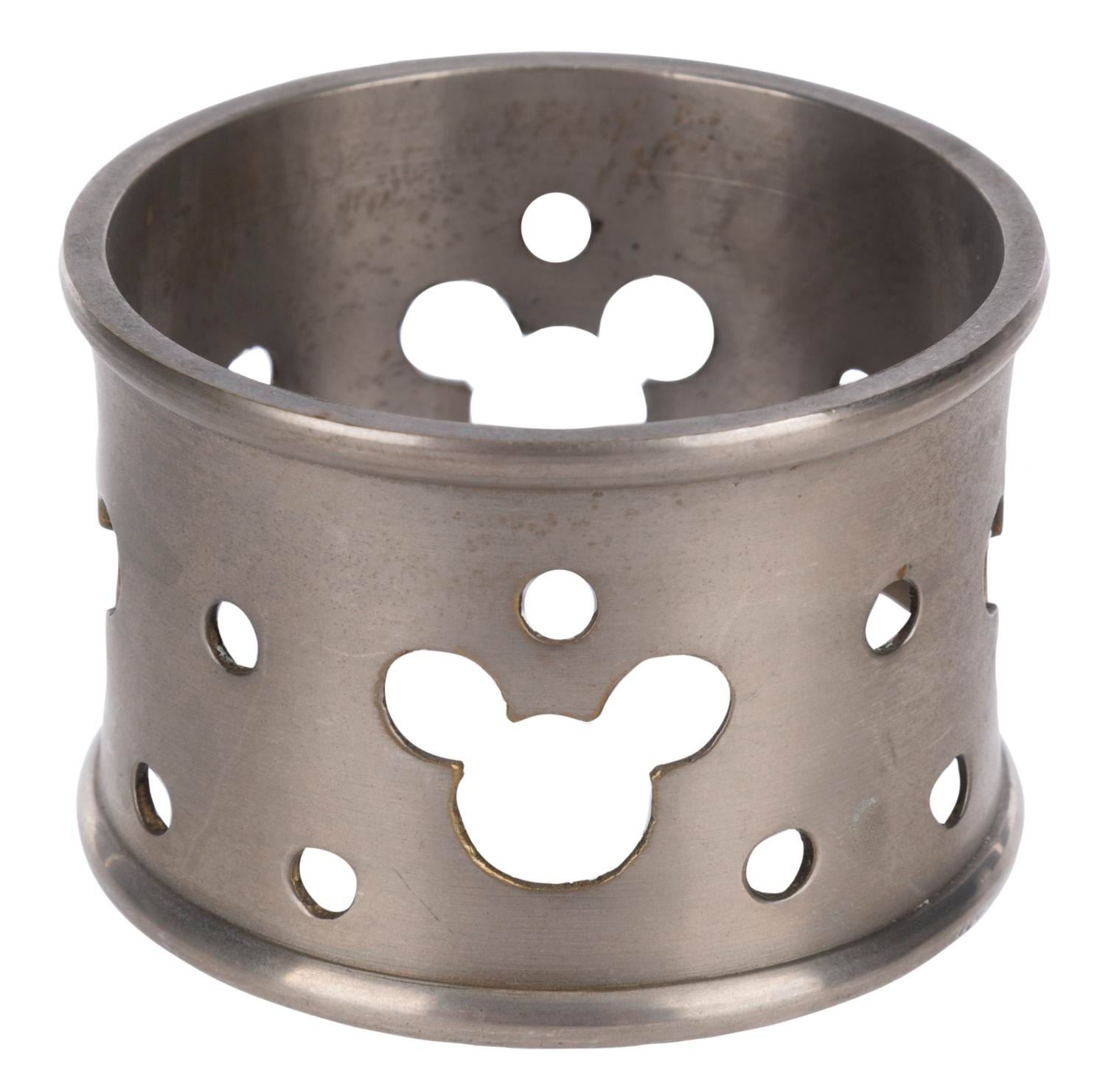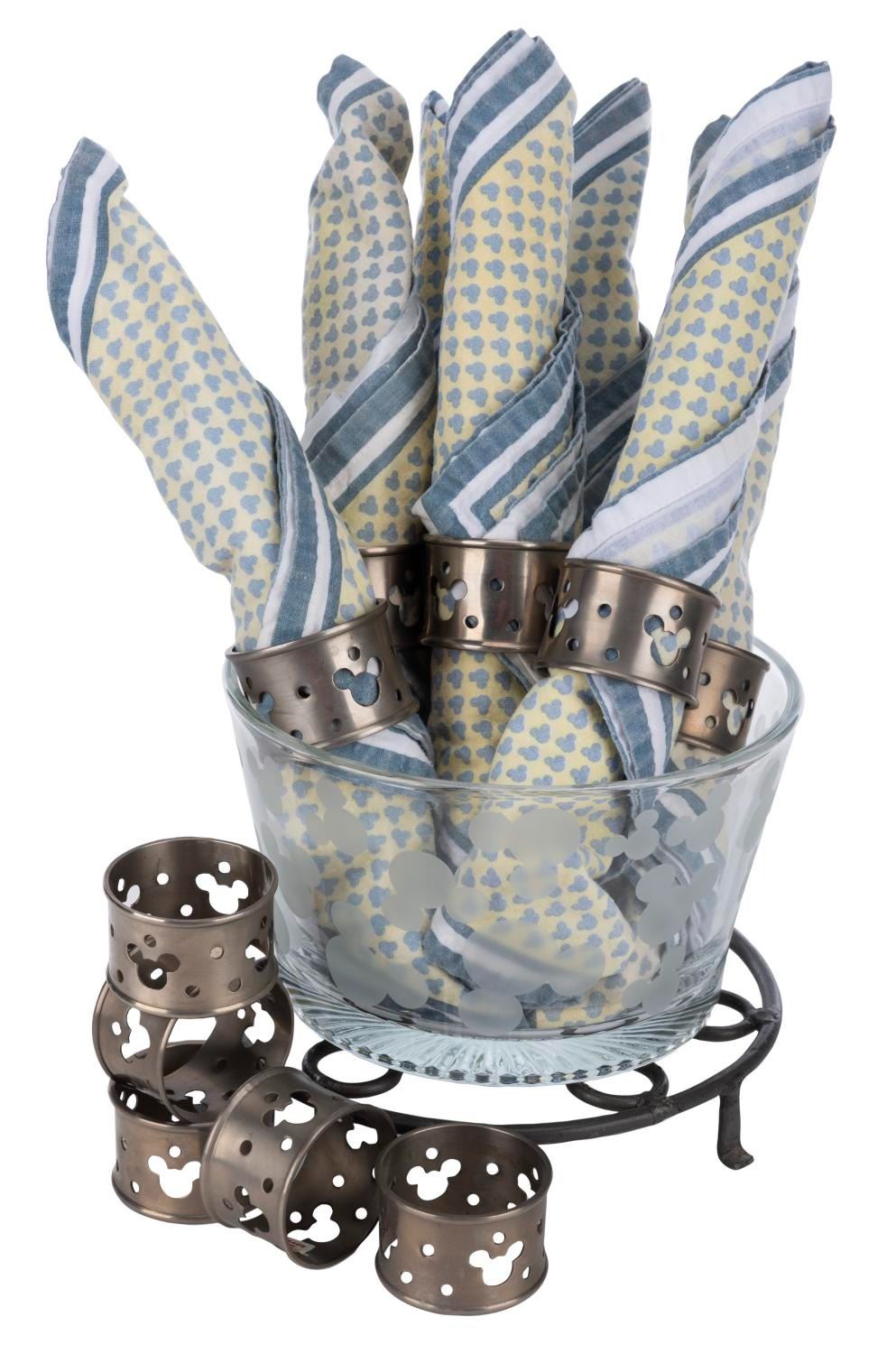 Mickey Metal Trivet, Glass Bowl, Napkin Rings, Napkins.