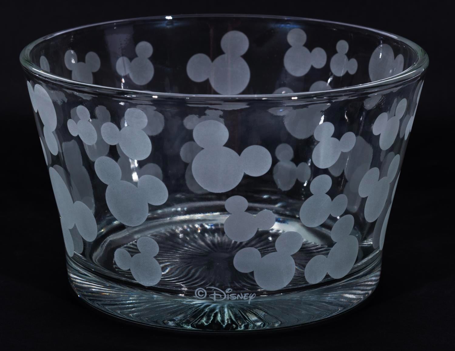 (Disney, 1980s-2000s) A Mickey Mouse metal trivet, glass bowl, set of 12 napkin rings, and 7 cloth napkins. The napkins measure 17” x 19.5” each, the bowl 7.5” in diameter, the rings 2” in diameter, and the trivet 7” in diameter. All items are in good to very good condition with light scratches, wear, and discoloration on the napkins from age.