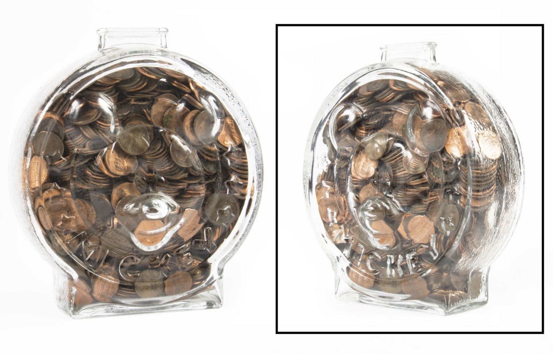 (Disneyland, c.1980s) A double-sided piggy bank featuring the faces of Mickey and Minnie. This bank has been filled with pennies by the original owner which provides a unique backdrop to the clear faces of the characters. This glass jar was likely a Main Street souvenir from approximately the 1980s, although some of the pennies inside are from more recent years. Measuring 7" tall, 6" wide, and 3" deep, the piggy bank is in good condition with some wear from use.