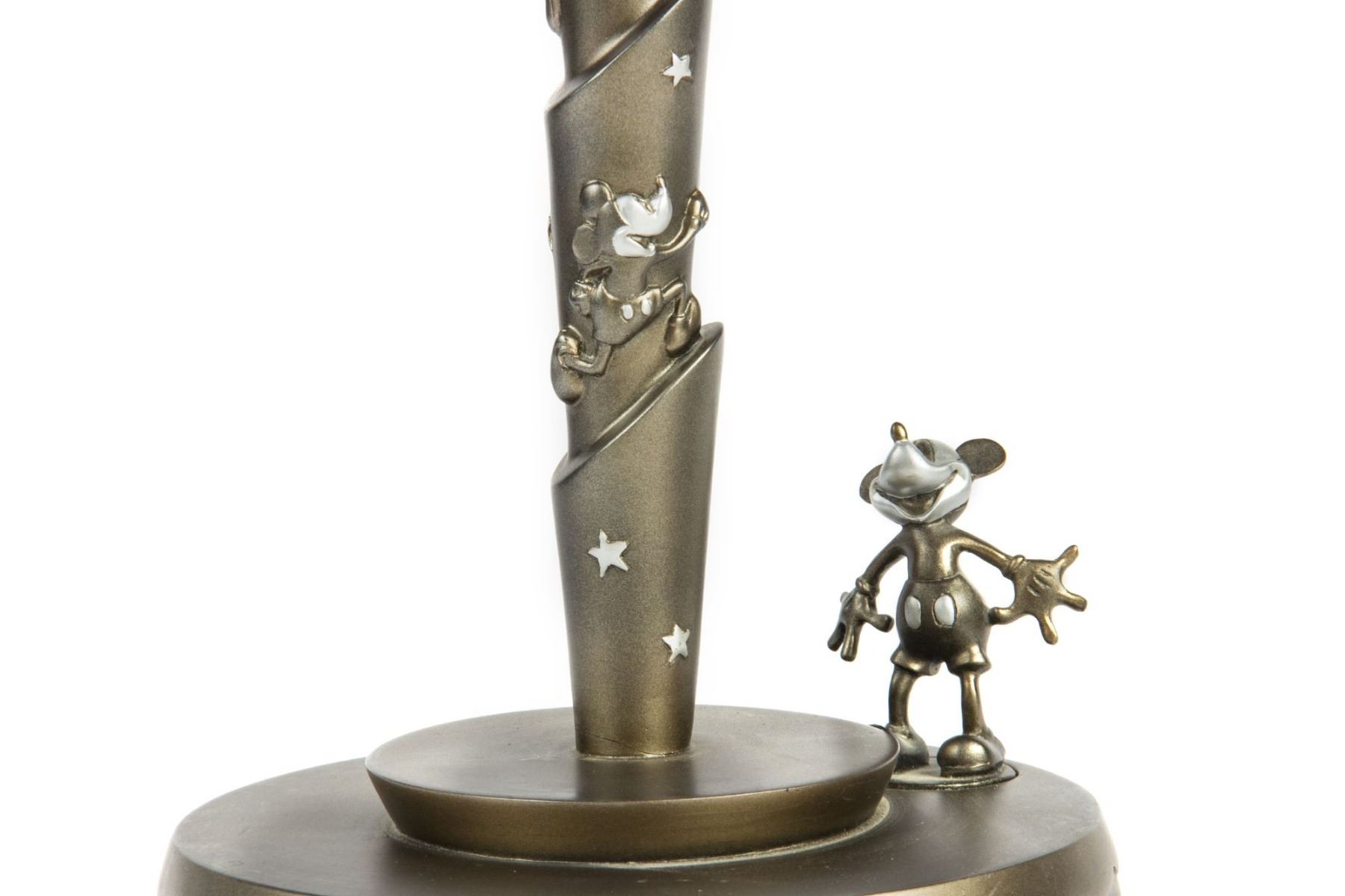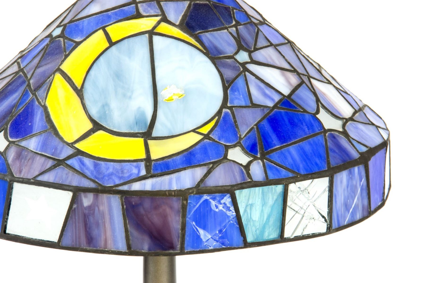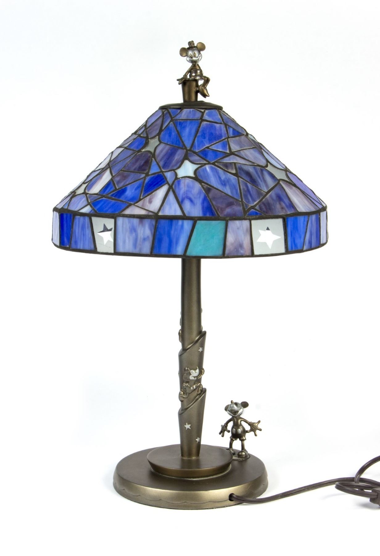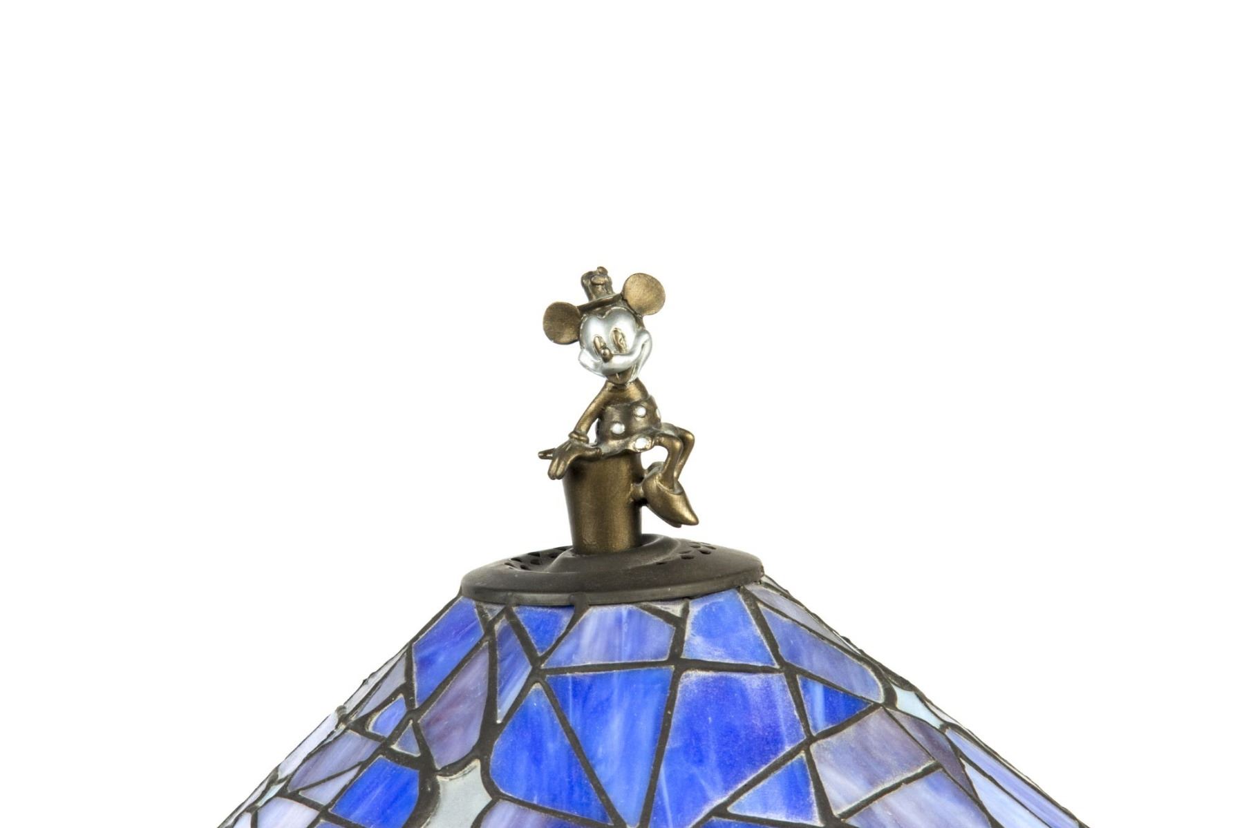 (Disney, 2003) A limited edition stained glass lamp created for the 75th Anniversary of Mickey and Minnie Mouse in 2003. The lamp depicts Mickey along the base and Minnie at the top of the lampshade, and when the lamp is turned on, a hidden image is revealed of Mickey and Minnie sharing a kiss within the moon portion of the lampshade. Created in an edition of only 2500, this lamp beautifully represents the history of Disney animation and the life of Mickey and Minnie. Measuring 21" tall, the lamp is in good condition with a few cracked glass panels on one side of the lampshade and a thin crack along the base of the stand.