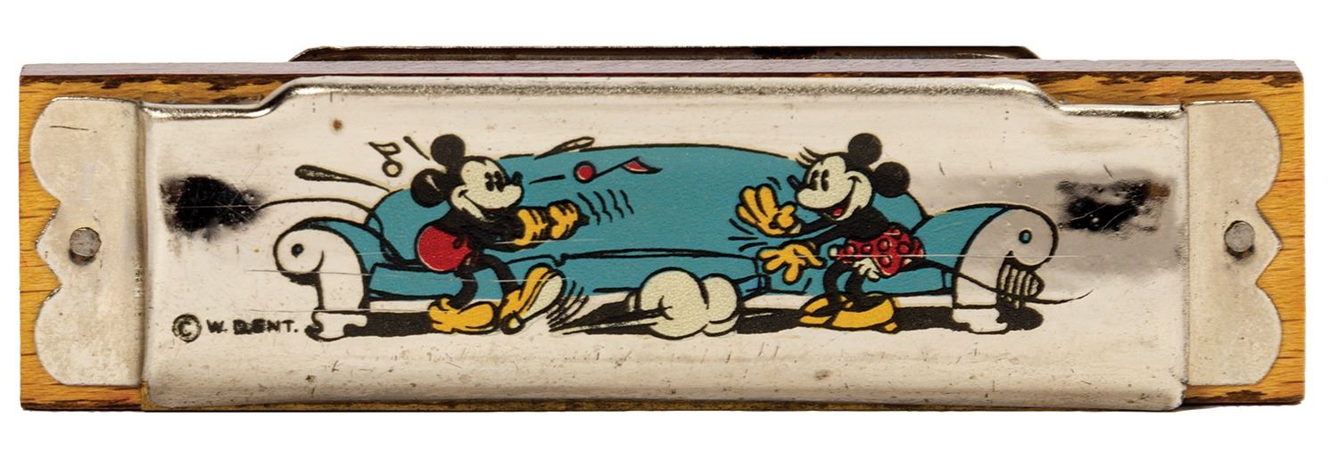 (Disney, c.1930s) A charming harmonica featuring Mickey and Minnie. Especially given the prominence of music in the early Mickey shorts, musical items such as this were very popular choices to feature Mickey's image. Measuring 1"x4", the harmonica is in very good condition for its age with minor wear from use, including some scuffing and scratching to the metal surface.