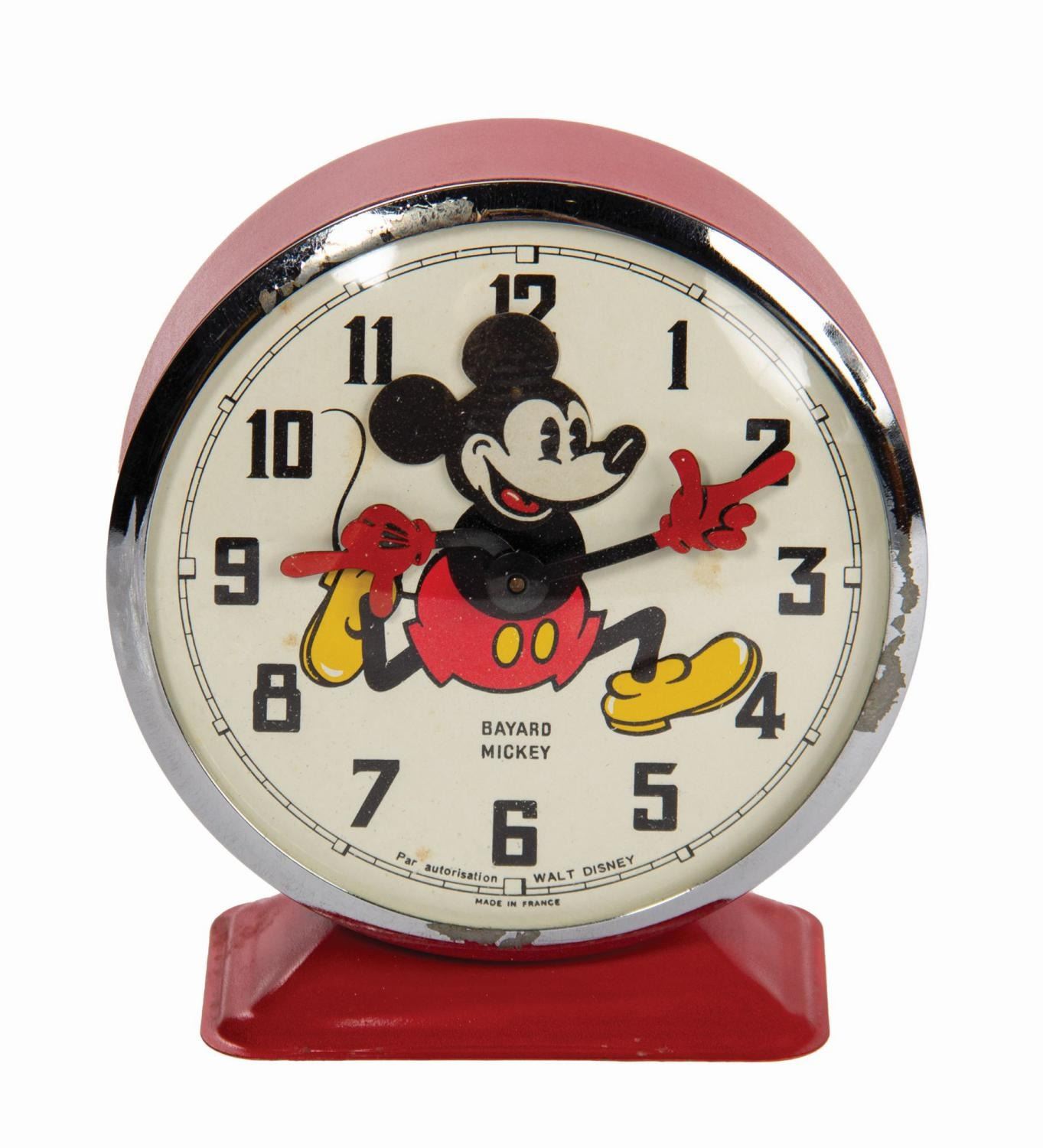 (Bayard, c.1960s) A vintage Mickey Mouse alarm clock by Bayard. This French-made clock features an image of Mickey with his arms as the hour and minute hands, while his head ‘nods' to mark the seconds. Measuring approximately 4.5" in diameter and 5" tall, the clock is in very good condition with some surface wear and paint loss. Both the clock mechanism and the alarm are functional.
