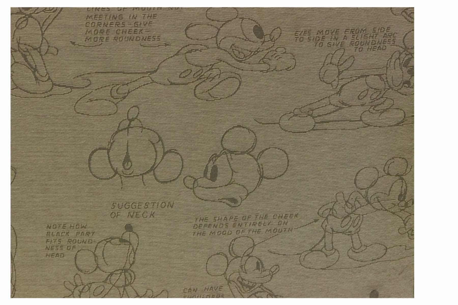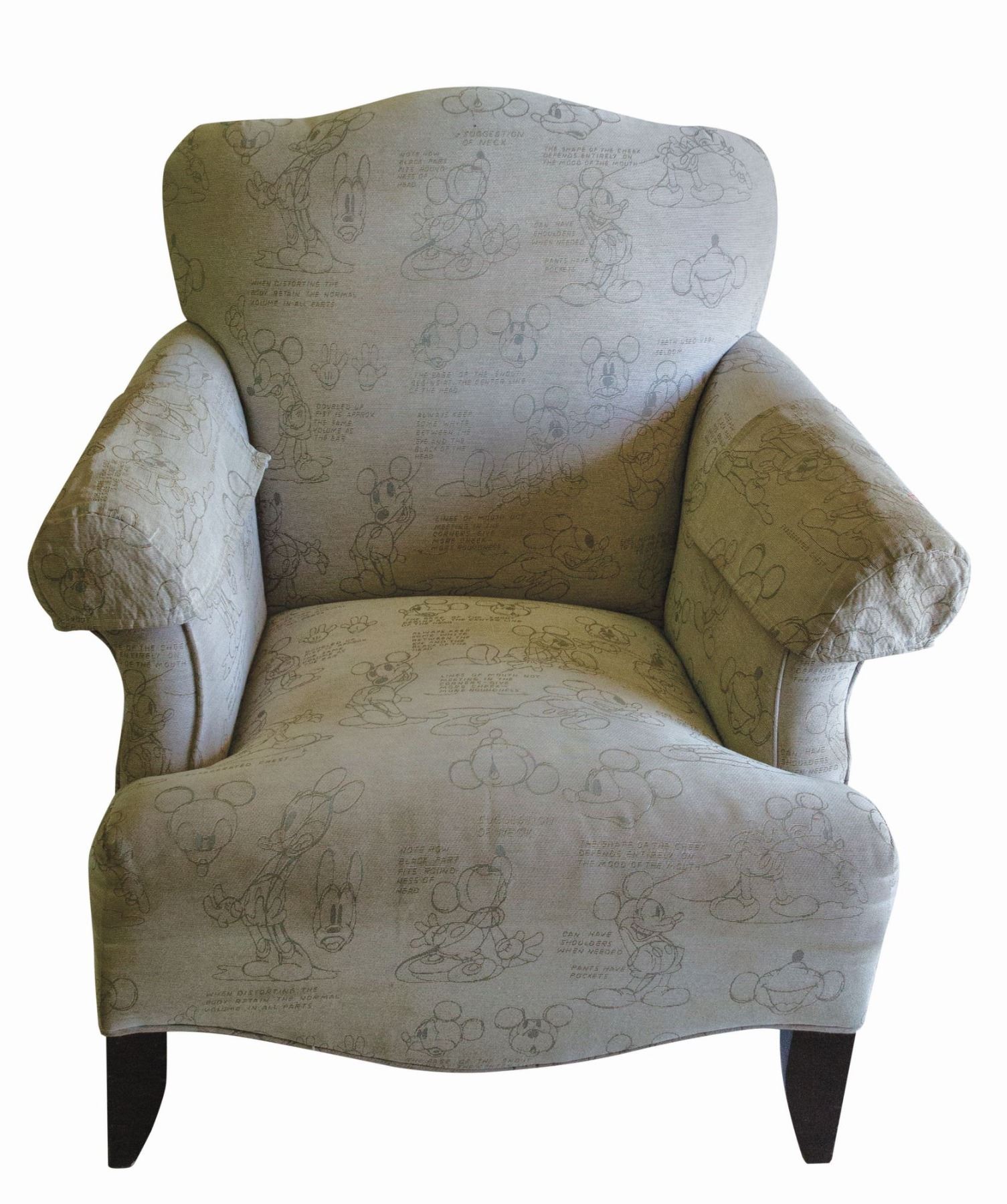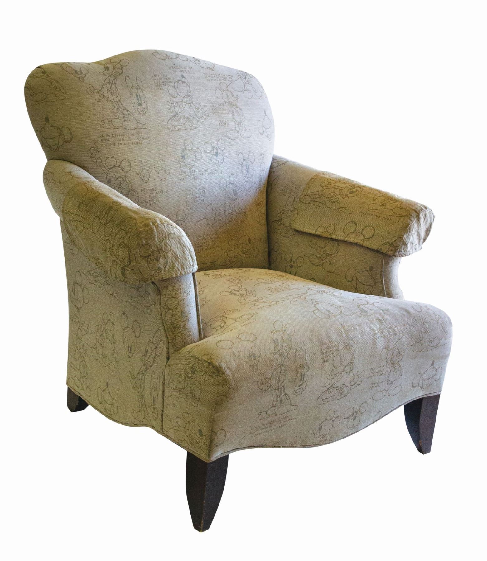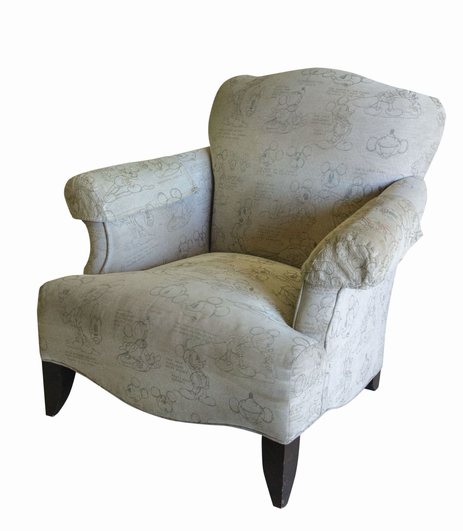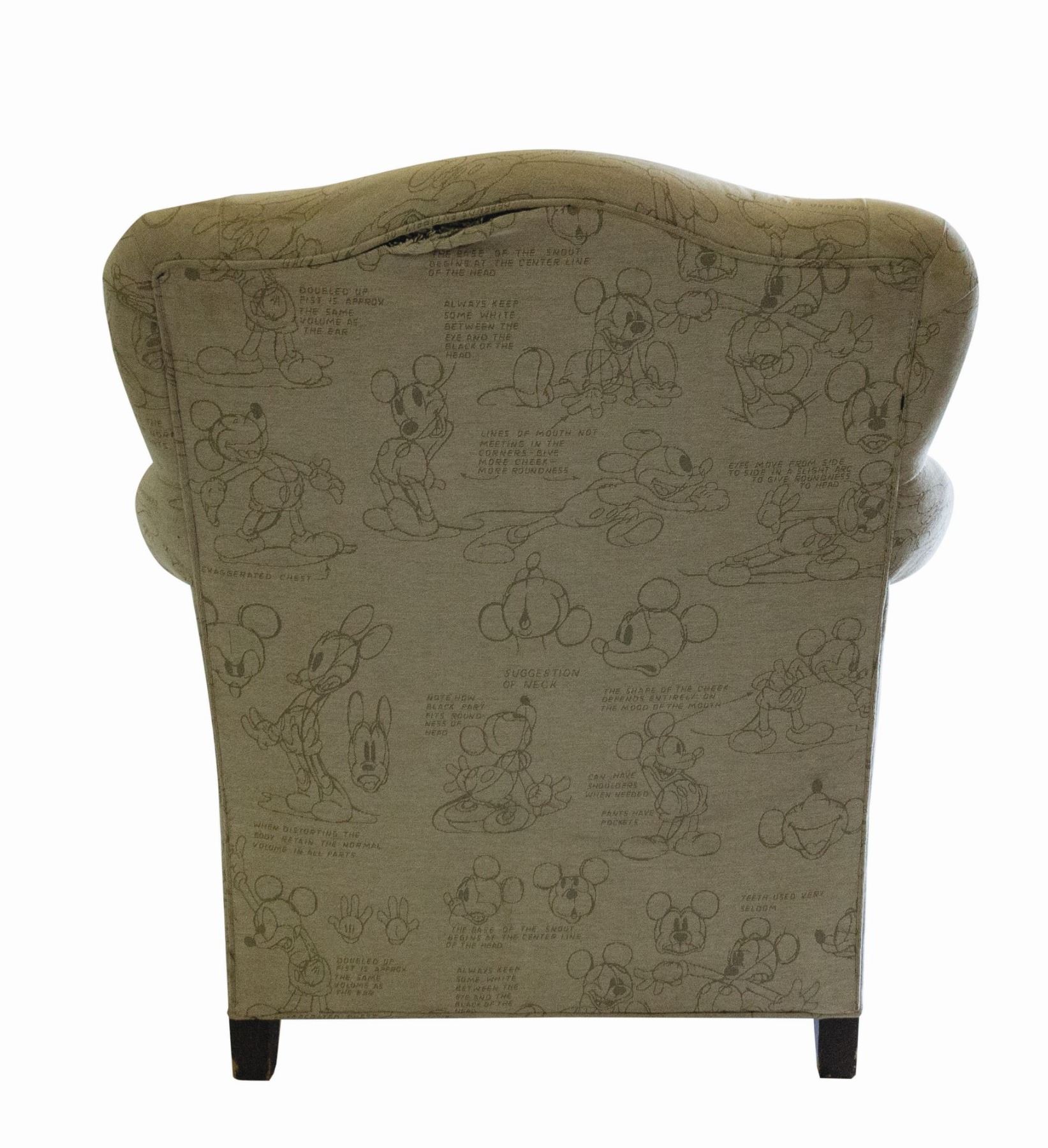 (Walt Disney World, 2000s) A stylish armchair sold at the Art of Disney stores at Walt Disney World in the early 2000s. The chair features a wonderful pattern depicting Mickey Mouse, as would be seen on an animator's character model sheet. The chair still includes its matching arm covers, and measures 37" tall. The condition is fair overall, with some wear throughout from previous use, including some discoloration to the arm covers, and surface wear. The top of the back of the chair has some wear at the seem, however the chair still presents itself well and would be a wonderful addition to the home of any Disney fan. This item will require special shipping arrangements. Please contact us for details and estimates.