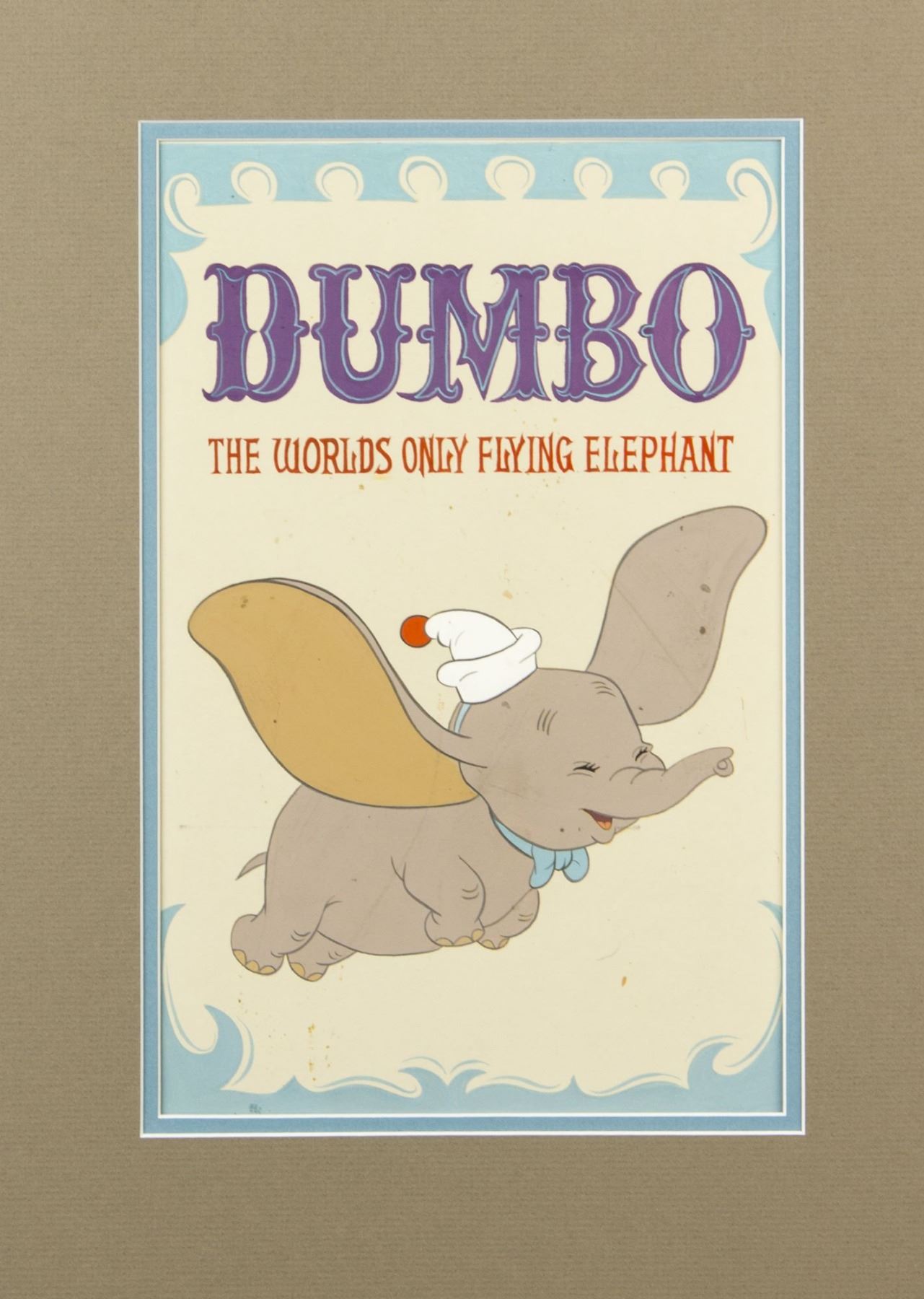 (Disneyland, c.1955) A painting created for a "Mickey Mouse Club Circus" side-show poster. Accomplished in acrylic on artist's board, this painting features imagery of the Dumbo, the "World's Only Flying Elephant". The approximately 15"x11" painting includes a custom 20"x16" mat, and is in good condition with some specs of discoloration throughout the image. The artwork is adhered to a foam core backing for its protection.