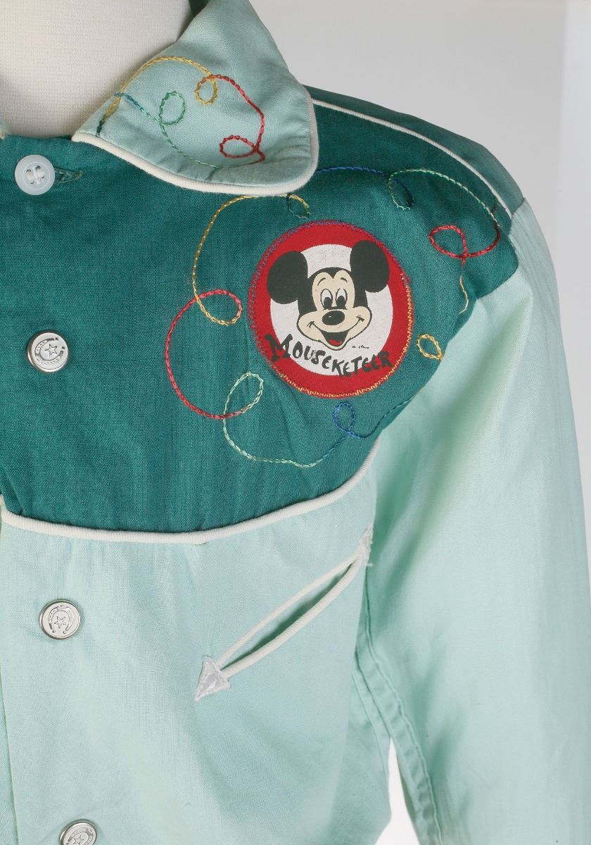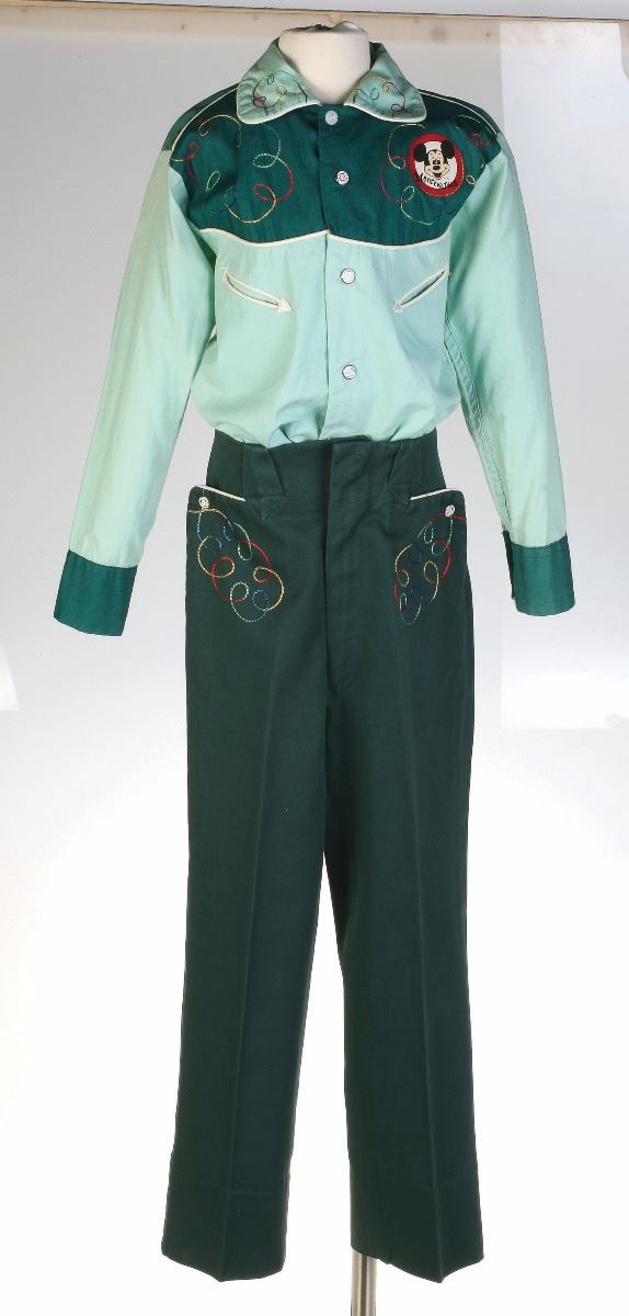 (Walt Disney Studios,1955) Mouseketeer Cubby's ensemble consisting of a child-sized western-style lime green long-sleeve shirt with a forest green yoke and cuffs, an applied circular embroidered "Mouseketeer" logo patch featuring a smiling Mickey Mouse at the proper left chest, diagonal slit pockets at the chest, and matching forest green trousers. Cubby O’Brien was featured seasons 1-3 as one of “the original nine,” and he has the distinction of being the cast’s only true musician who could perform on-camera. His ensemble was worn on “Mickey Mouse Club” (1955-1959), as well as a photo on the cover of a Walt Disney Magazine of the era, and the shirt is marked within “W.D.P.” (for Walt Disney Productions) and was acquired from a former Disney costumer.