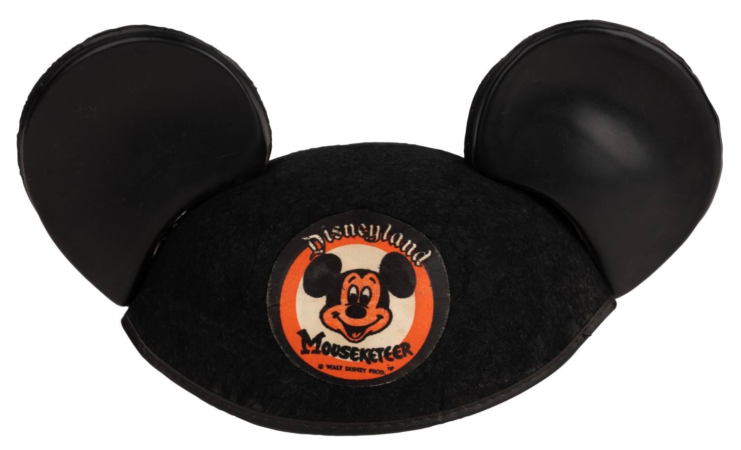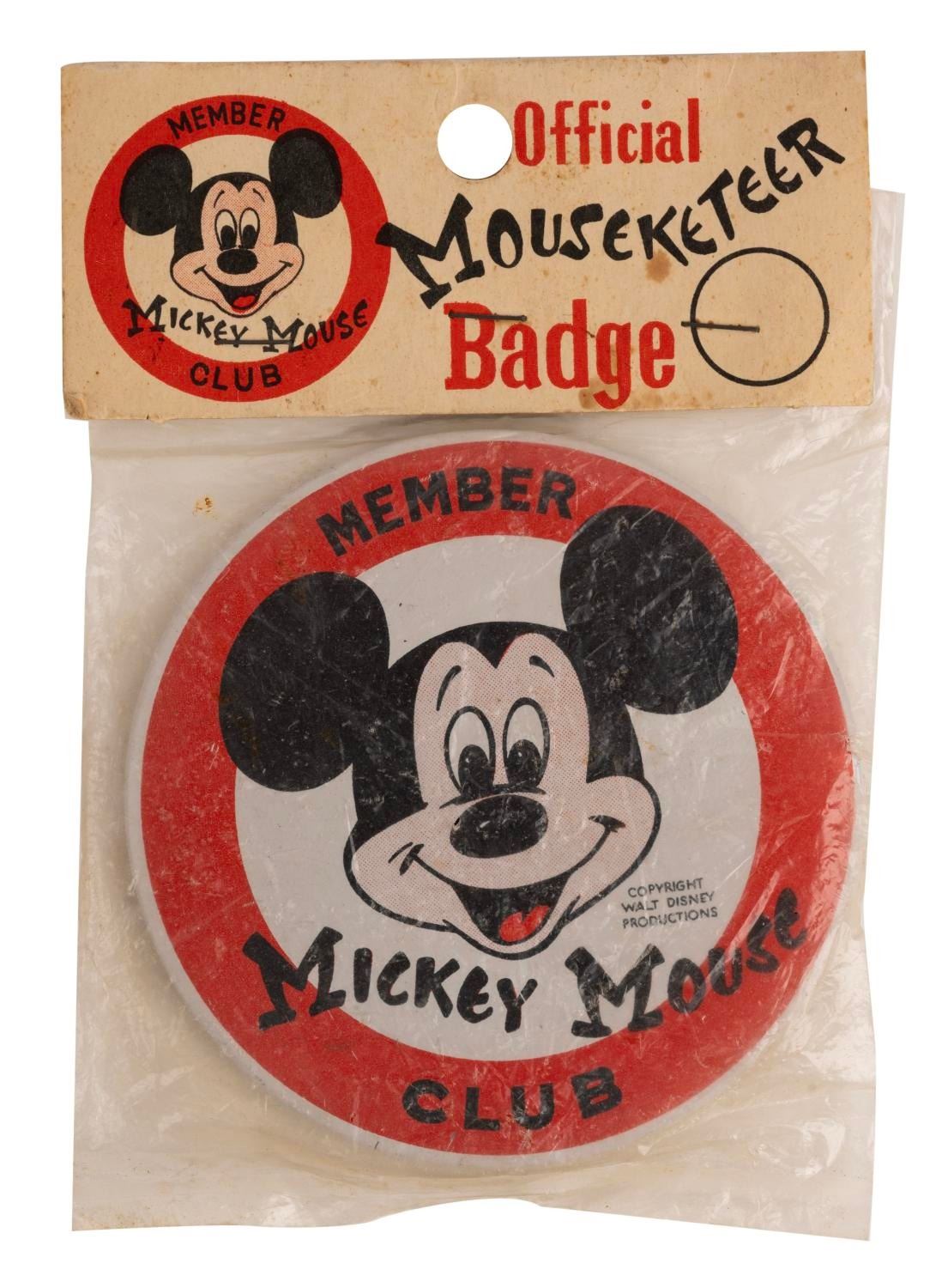 (Disneyland, 1950s-60s) A Disneyland Mousketeer ear hat and an official Mouseketeer Badge in the original package. The 11" wide ears are in very good condition. The 3.5" badge is in very good condition with light wear from age, with the 3.75" x 5.5" bag and card in good condition with wear from age.
