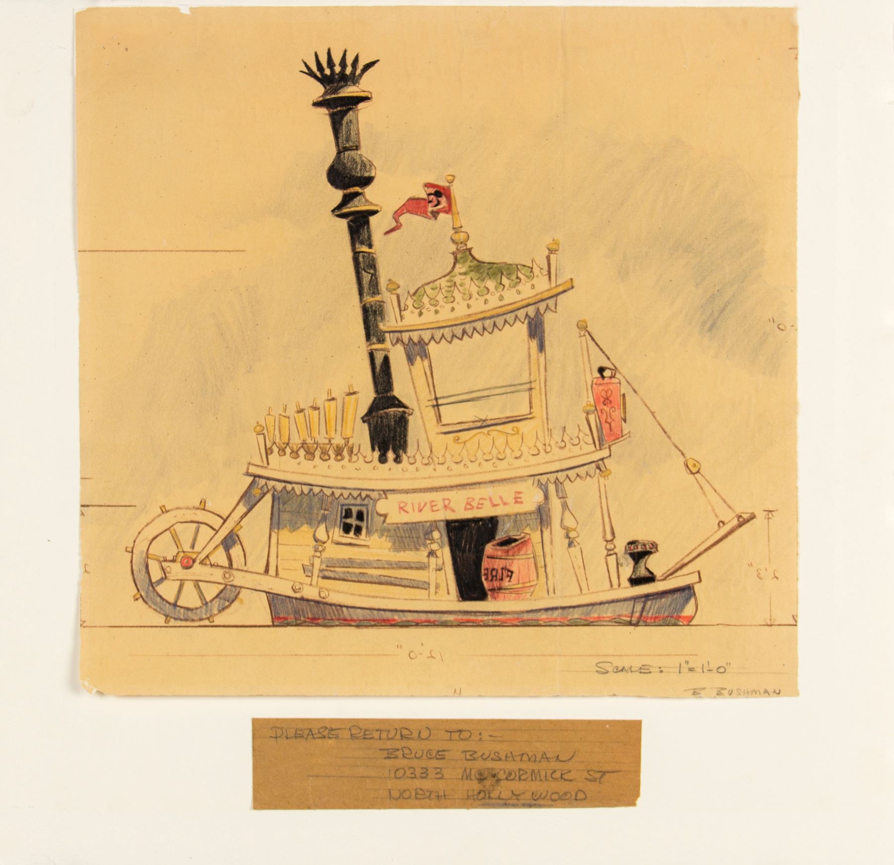 (Disneyland, c.1955) An original hand-colored concept brownline by Imagineer Bruce Bushman for a river boat named "River Belle". This concept was used to design a set piece for the Mickey Mouse Club television show, and is signed by Bushman in pencil in the lower right corner. The brownline was made in reverse from the original pencil drawing, so words like "fire" and the dimension numbers along the bottom appear backwards on this brownline. The brownline measures approximately 14.25"x15". The condition is very good with minor edge-wear and a thin strip of tape on the top edge of the back side. The brownline also comes with Bushman's handwritten "please return to" address label for this brownline, which includes his name and former address.
