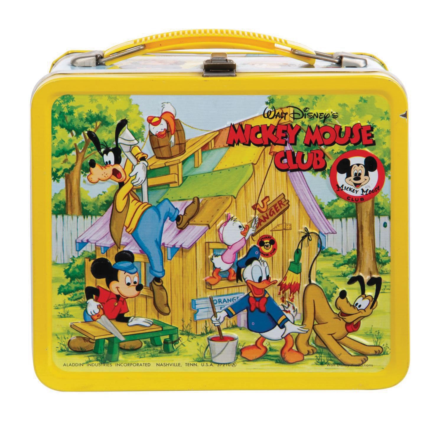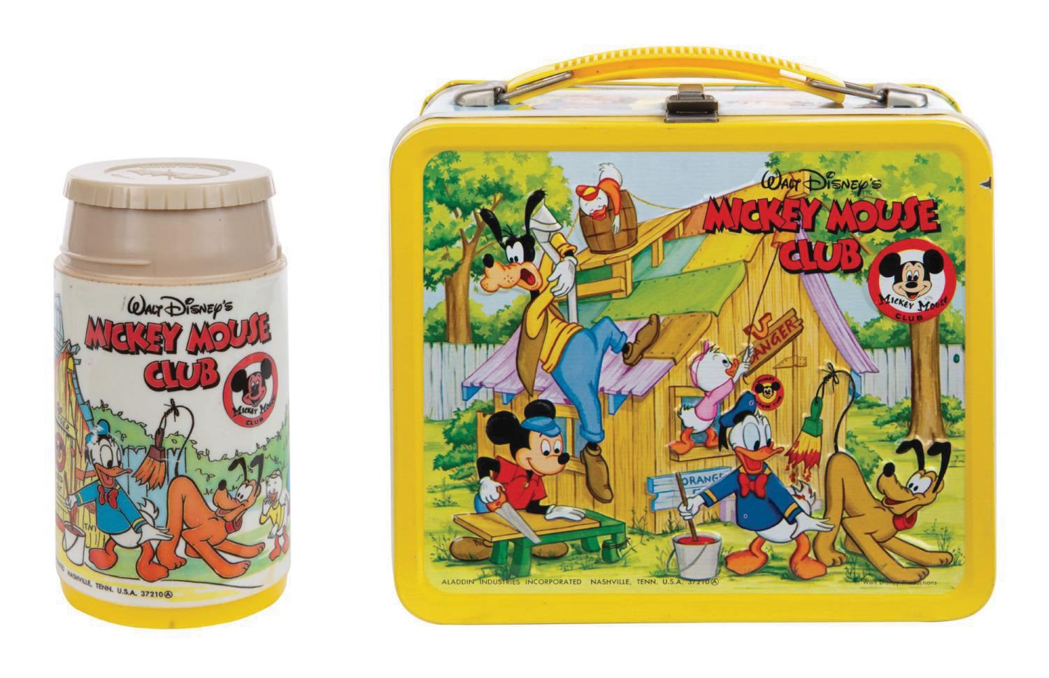 (Aladdin, 1976) A vintage Mickey Mouse Club embossed tin lithographic lunch box with matching thermos. Manufactured by Aladdin Industries, the lunch box features vibrantly colored imagery of animated Disney characters, as well as cast members of the original television series. The lunch box is equipped with an internal arm for securing the thermos. Measuring 7"x8" and 3.75" deep, the lunch box exterior is in very fine condition with minor scratches and scrapes, while the interior exhibits oxidation and signs of use. The thermos is missing its cup lid but is in otherwise fair condition with some color fading and scuffs on the surface.