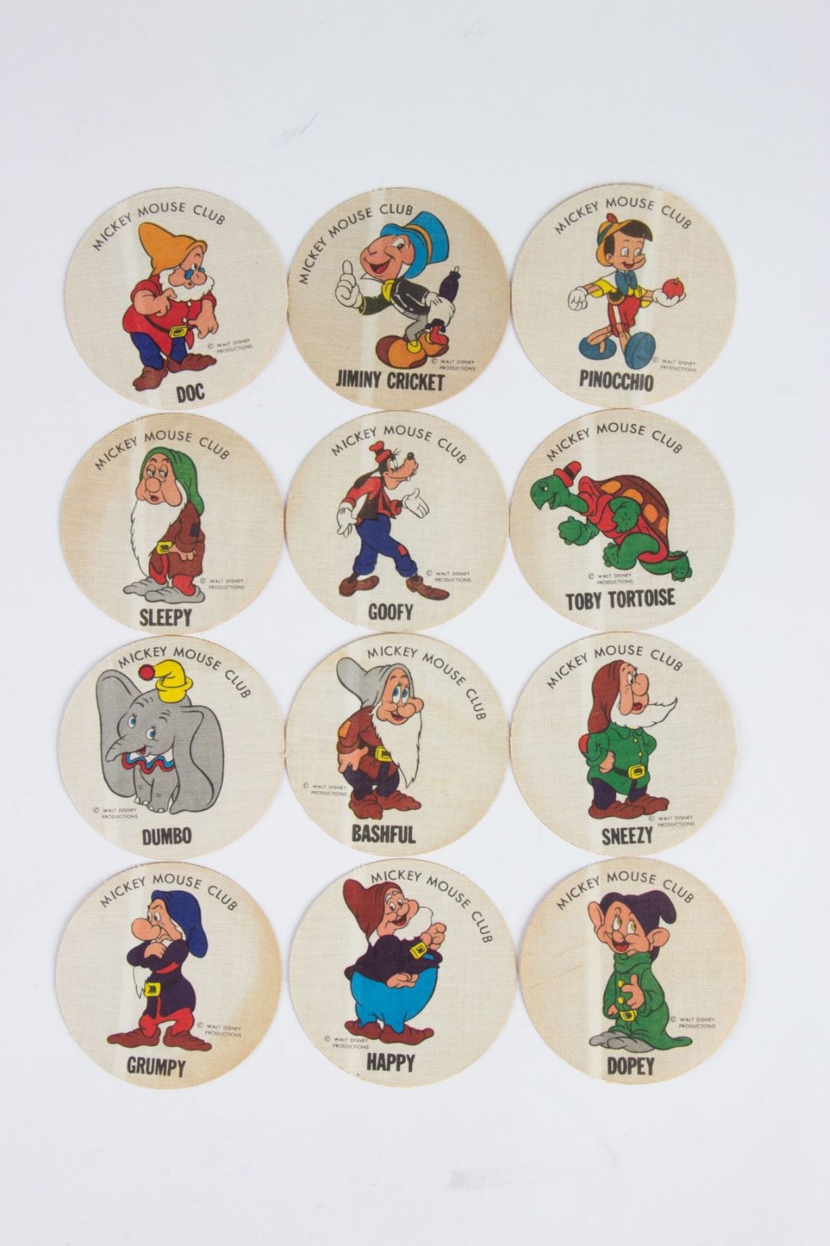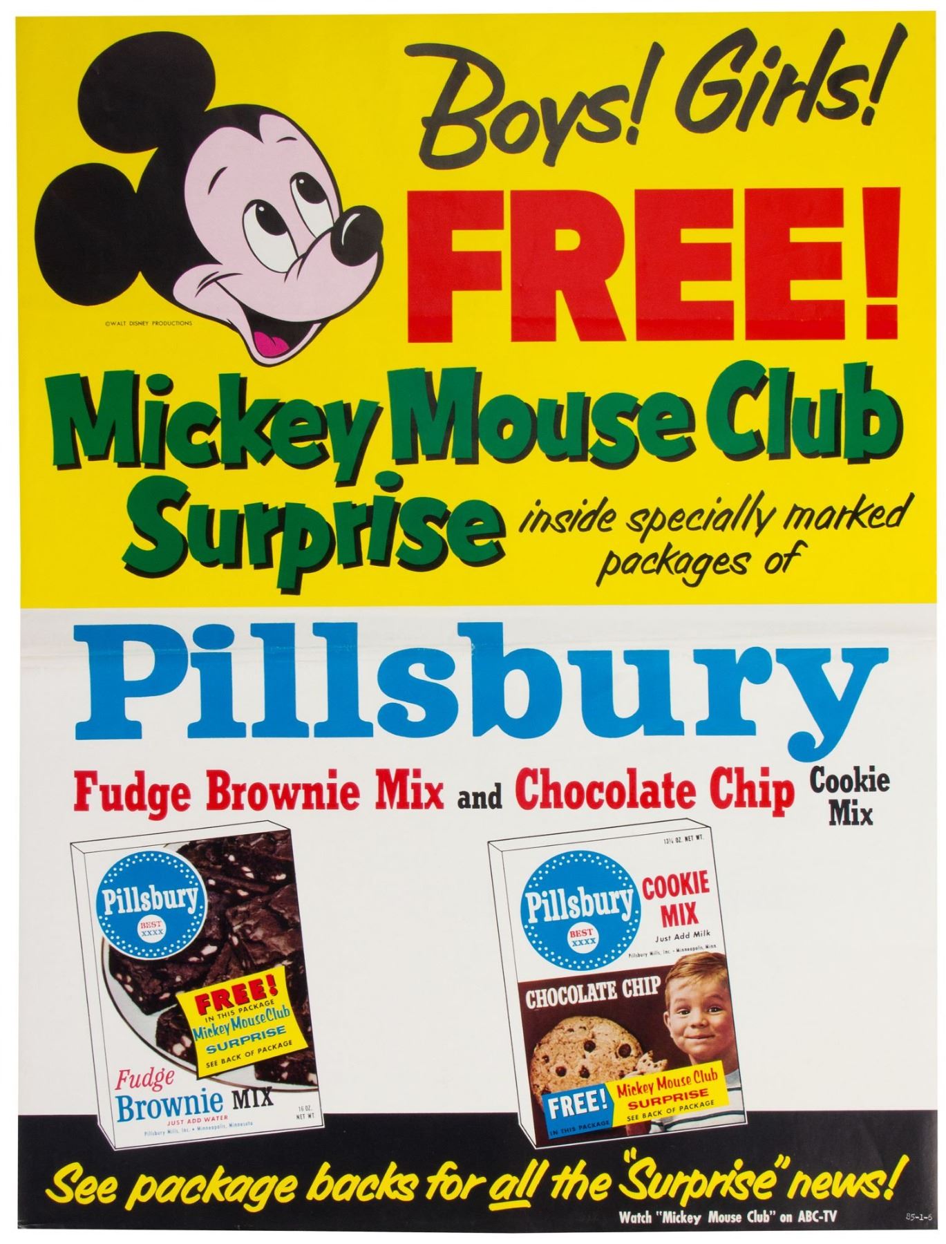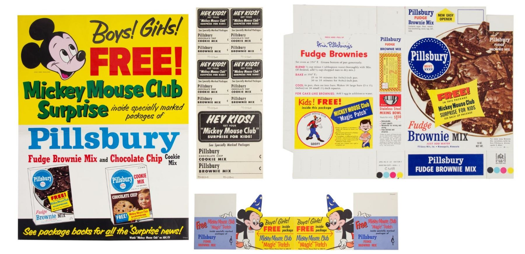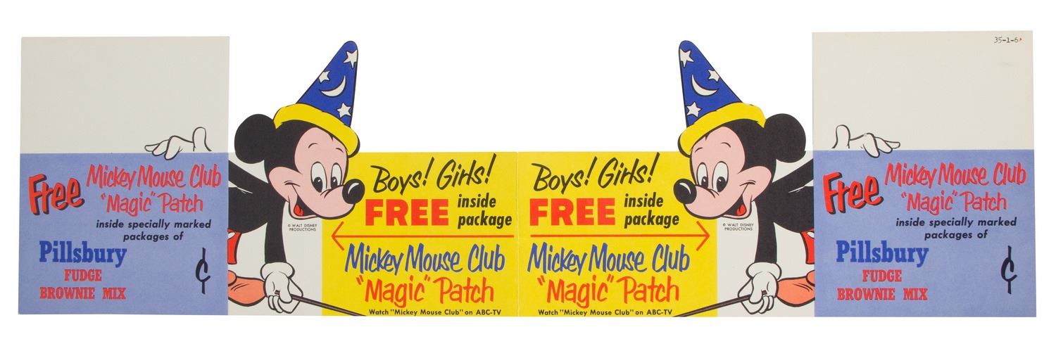 (Pillsbury, c.1950s) A set of Mickey Mouse Club promotional items created in partnership with Pillsbury. These items relate to a promotion in which Pillsbury was offering Mickey Mouse Club "Magic Patches" featuring popular Disney characters. This set includes a store poster for the promotion, a complete unused set of all 12 "magic patches", an unused Pillsbury brownie mix box with the promotion information, a sheet of pricing stickers, and a die-cut double-sided stand. This set originally comes from the collection of Sam and Gordon Gold, creators of children's premium offers from the 1920s-70s. The patches measure 3" in diameter and the poster measures 24"x18". The set is in very good condition overall.