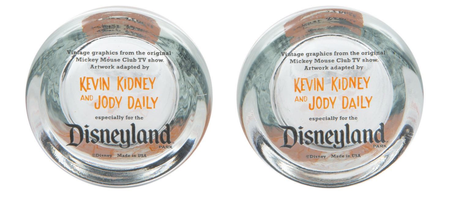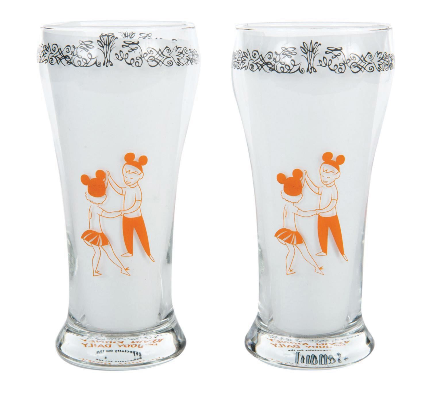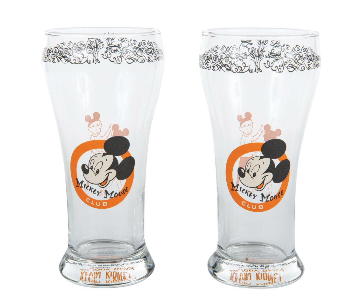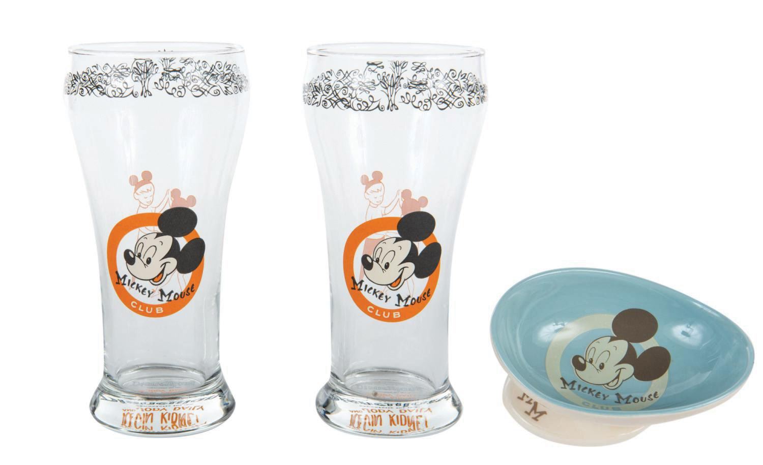(Disneyland, 2010) A limited edition set of Mickey Mouse Club soda shop style glasses and ice cream dish. Designed by Kevin Kidney and Jody Daily for the 55th anniversary of the TV series, these items were first available for purchase only to select guests at D23's Destination D: Disneyland '55 event. The blue ceramic bowl features the Mickey Mouse Club logo and measures 5"x3.5"x2.5". The 12 ounce glasses are 6"x2.75" with a full color show logo, and two dancing mouseketeers on the opposite. All three pieces are in very fine condition.