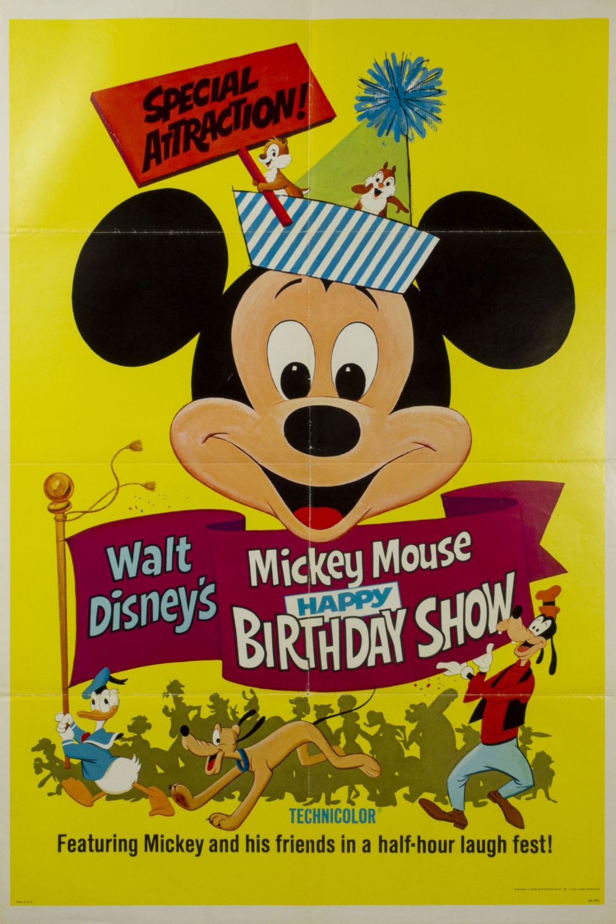 (Walt Disney Studios, c.1968) An original one sheet poster created for Walt Disney's Mickey Mouse Happy Birthday Show. The half hour compilation film was created in 1968 to celebrate the 40th birthday of Mickey Mouse, and this poster depicts Mickey in a birthday hat with Donald, Pluto, and Goofy below him. Measuring 41"x27", the poster is in good overall condition with some wear along the original fold-lines and minor creasing to the edges. The poster is marked as a re-release of the film, but the date code on the poster and the original ink stamp on the back both indicate that this poster was from 1968, so the re-release may have been later that same year.