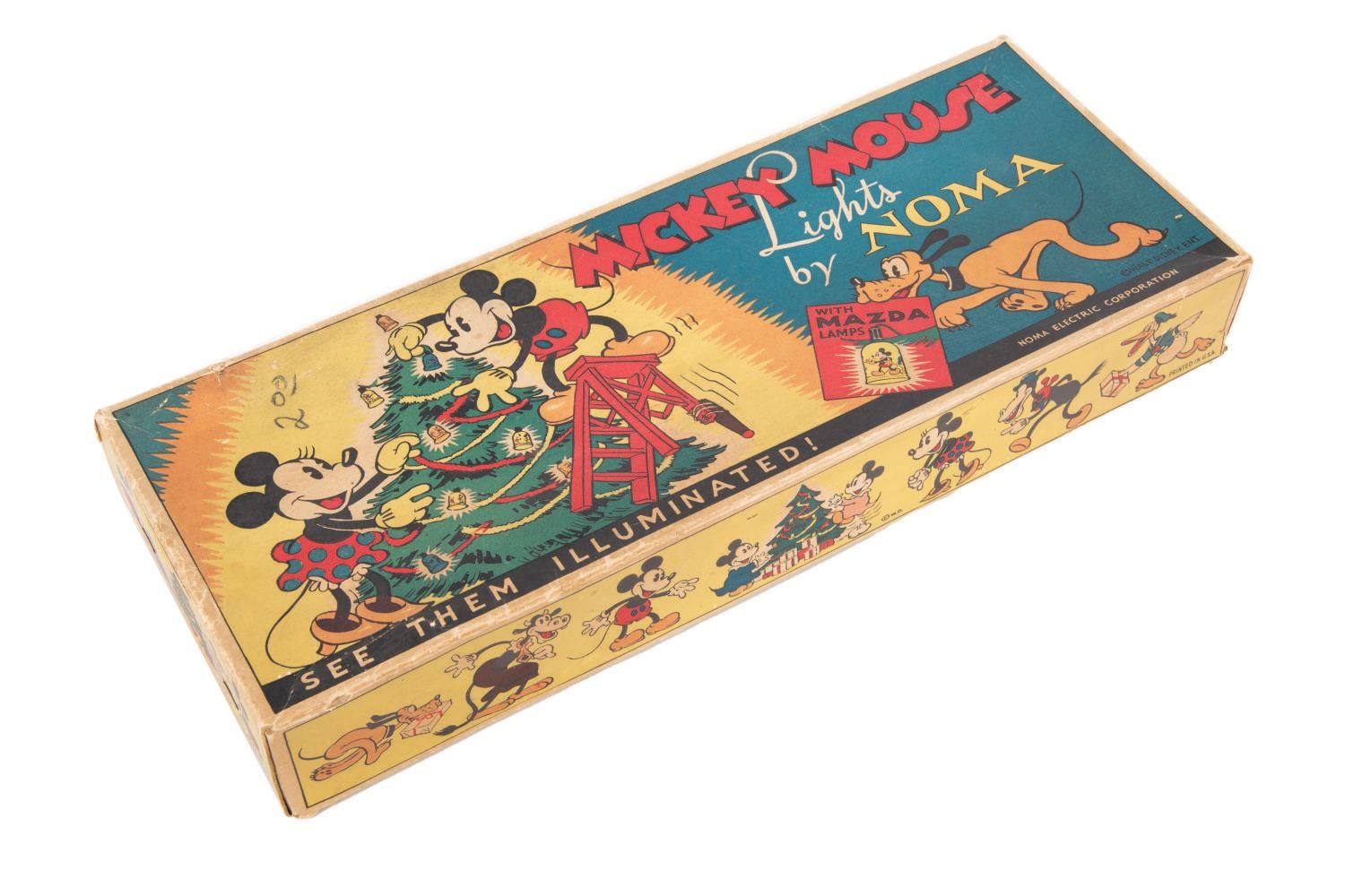 (NOMA, 1930s) A Mickey Mouse Lights set and box by NOMA. The (7) plastic shades feature Mickey Mouse and friends in festive holiday scenes with patented "berry-beads" to hold lights in the correct position on the tree. The lights come in their original box with directions and have not been tested for function. The lights display in good condition with minor scuffs and wear to imagery, while the box is in good condition with minor wear and scuffs to edges and corners.