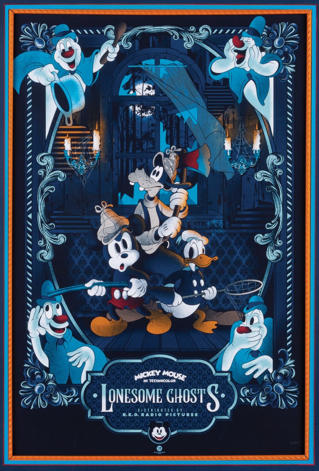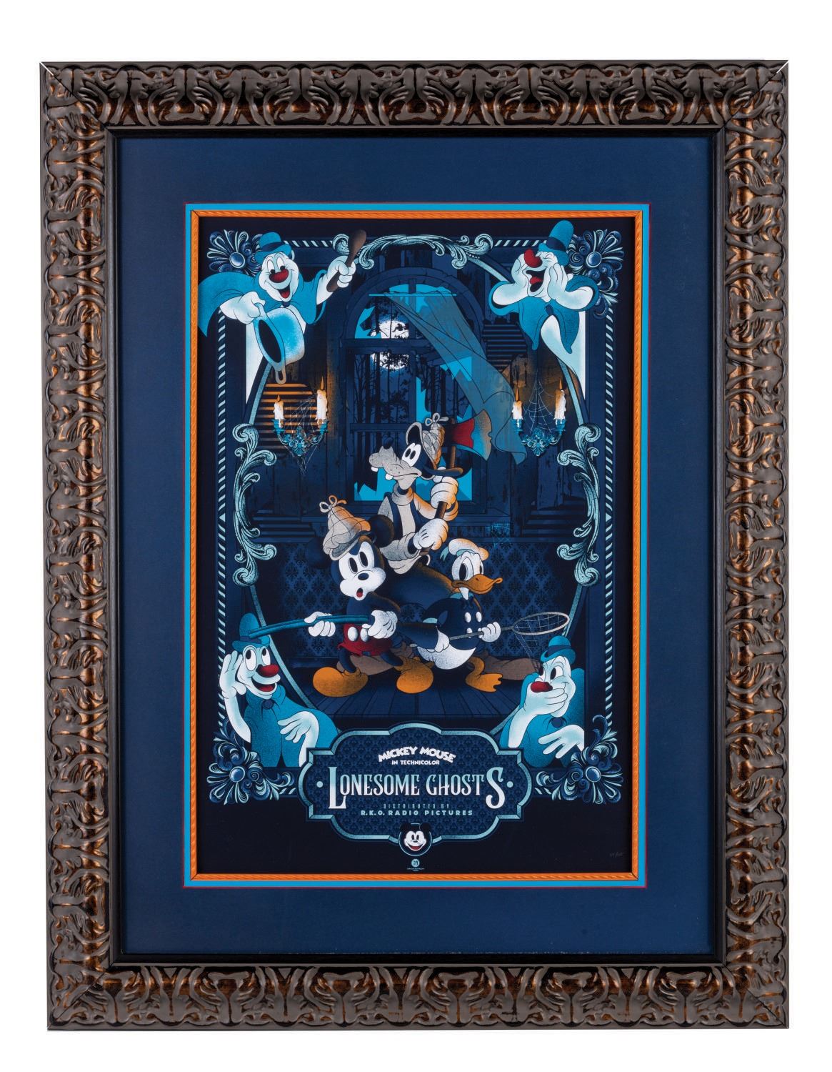 (Disney, c.2020-21) A Lonesome Ghosts silkscreened art print by Mainger. The prints were distributed through German Barthelemy Prints and The Disney Gallery in an edition of only 155 pieces. This piece is hand-numbered "55/155." Approximately 23.75"x15.75" of the art is matted and displayed within a 35"x27" frame and is in fine condition.