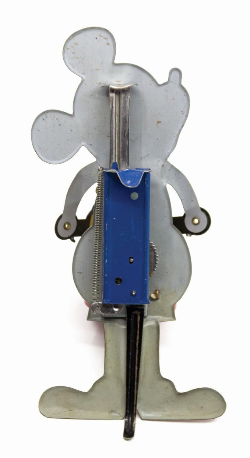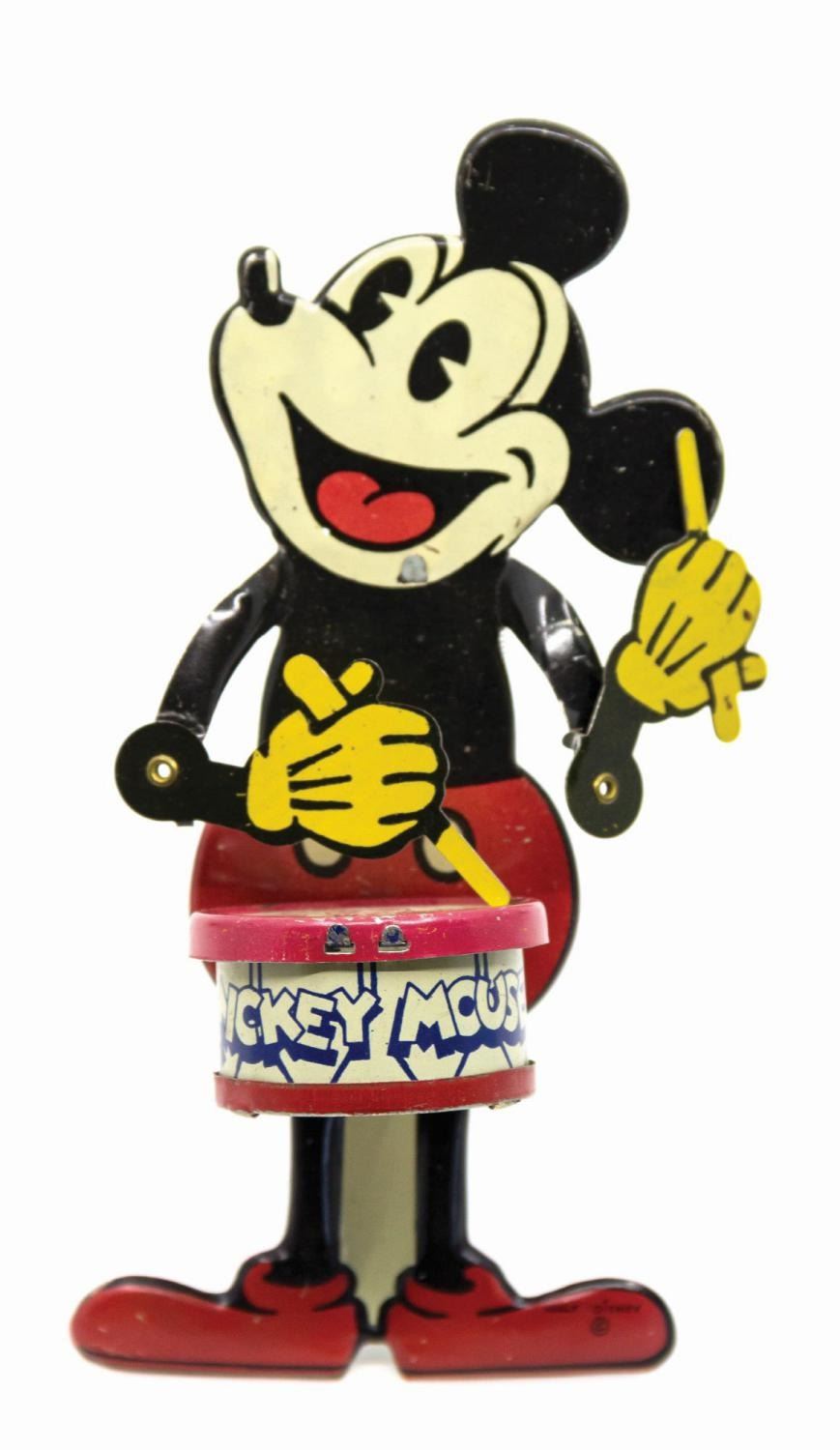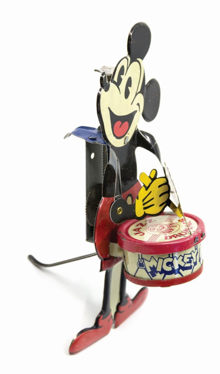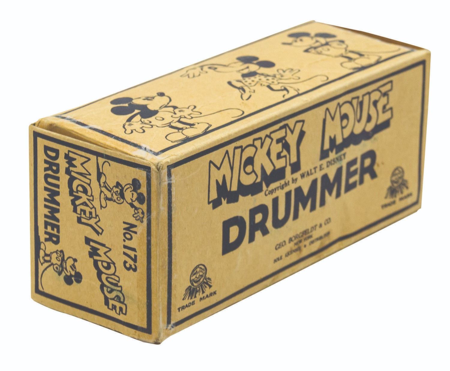 (Borgfeldt, 1931) A vintage tin-litho Mickey Mouse Nifty Jazz Drummer toy by Borgfeldt. Mickey's tail is present (often missing on these toys) and the mechanical components are in working order. The toy is accompanied by the original box, which is exceedingly rare. Measuring 6.5"x3.25" and 2.75" deep, the toy is in very good condition with some minor nicks and scratches. The box exhibits some spot surface loss, a 2" section of restoration to the face, all flaps at left reattached with transparent tape, and the right side flaps were recreated and applied with paper and transparent tapes.