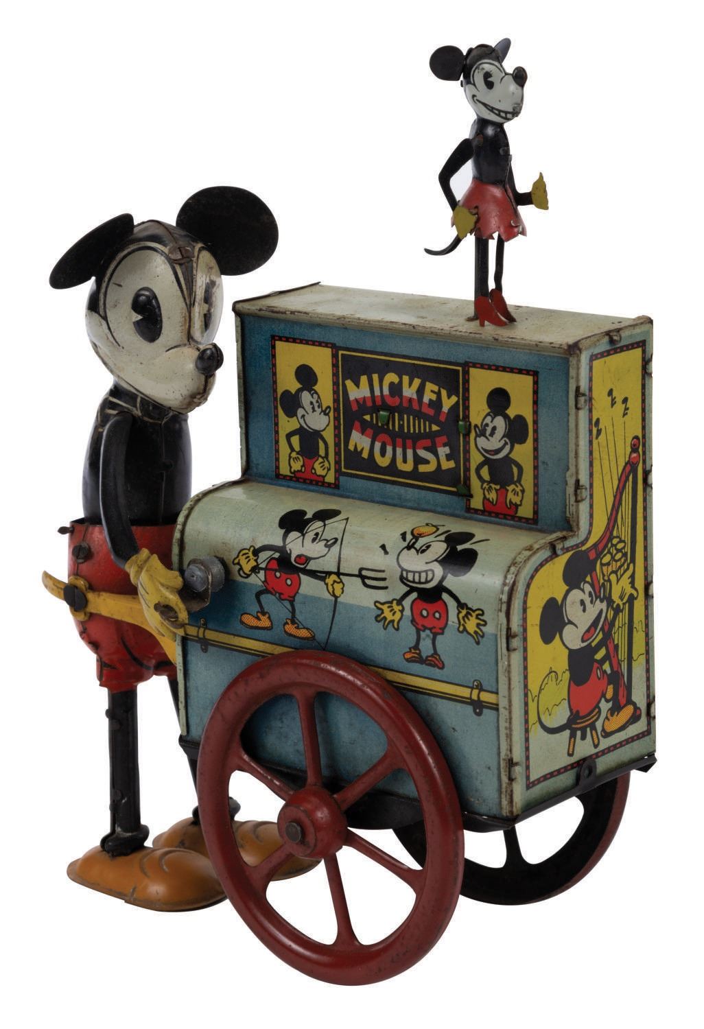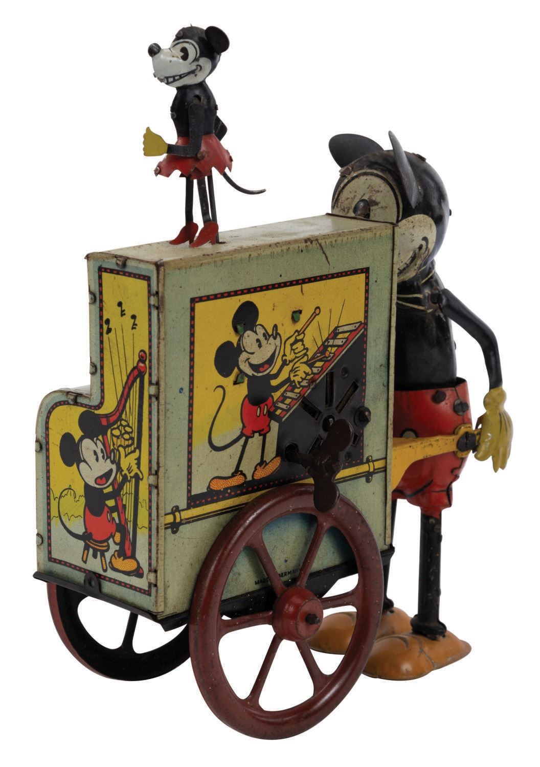 (Distler, 1930) An extremely rare German-made Mickey Mouse wind-up tin toy. The large Mickey Mouse figure is attached to and pushes a street organ that features multiple images of him. A separate small Minnie Mouse figure on a metal rod is attached to the top of the street organ. The toy works and as Mickey turns the crank, Minnie dances and musical notes are produced. This toy is rarely found this complete, with only Mickey's spring tail missing. The toy measures 3"x6"x8" tall and is in very good condition with expected wear from age.