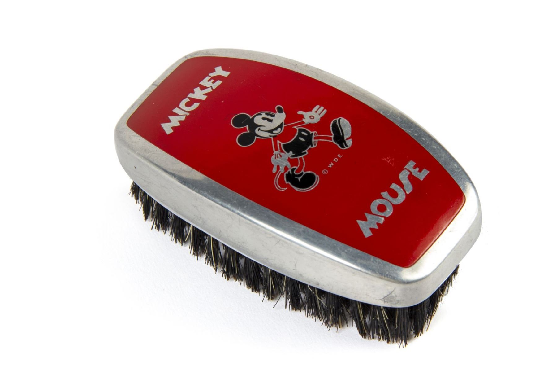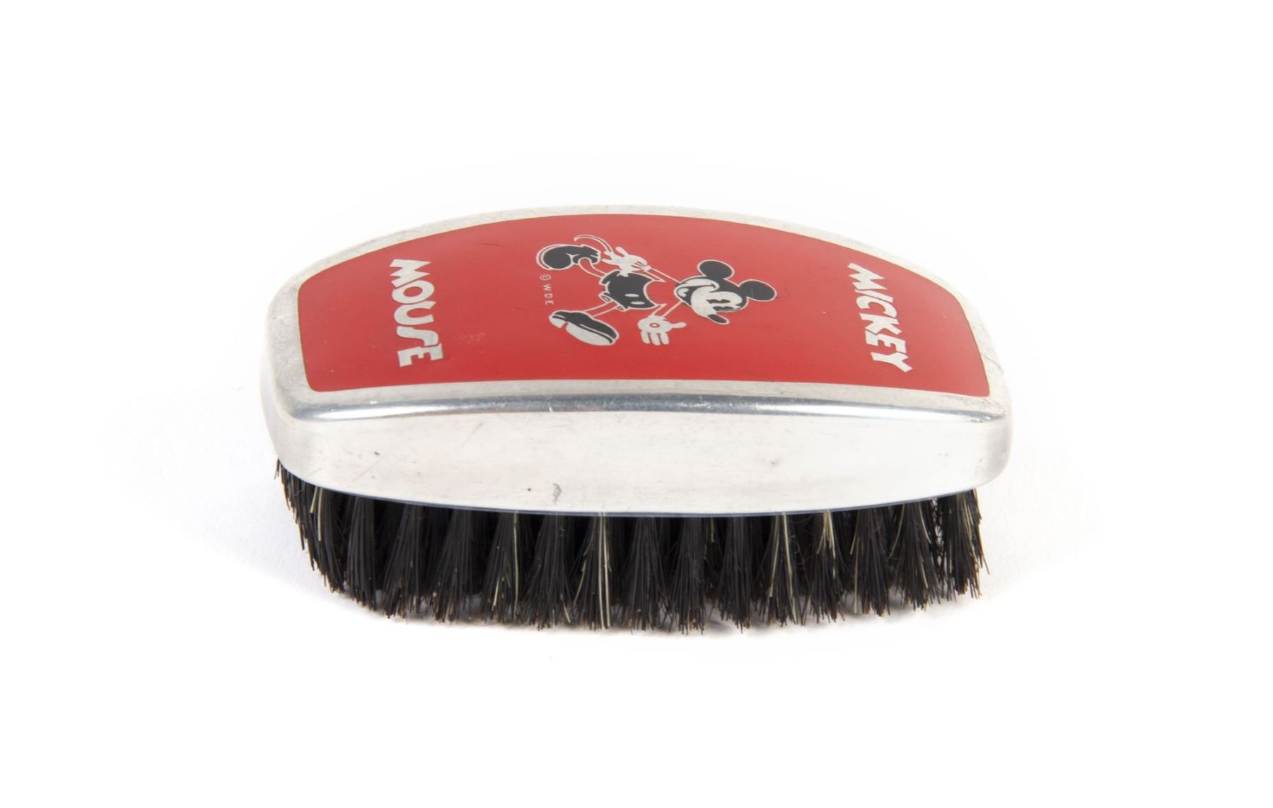 (Henry L. Hughes Co, 1930s) A tin and wood Mickey Mouse shoe brush with a wonderful vintage depiction of Mickey on the top and a Walt Disney Enterprises copyright mark. Measuring 4" long, the shoe brush is in very good condition with some small areas of wear to the wood from use and age.