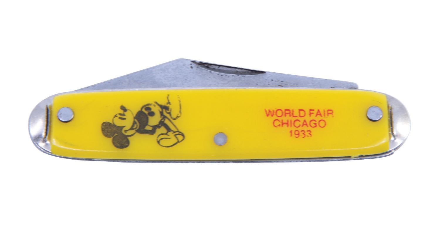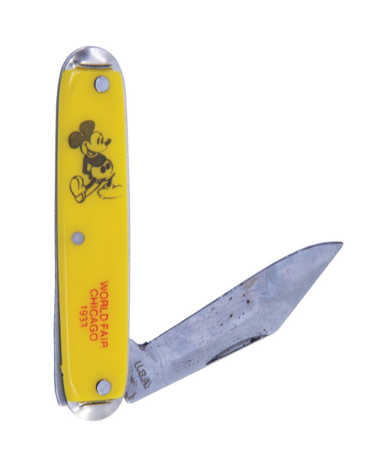 (Unknown, 1970s) An infamous souvenir pocket knife featuring Mickey Mouse. These knives appeared in the collector's market around the 1970s and are marked as if they were sold at the 1933 Chicago World's Fair. However, the Mickey Mouse image on the knife is a more modern version that would not have been used in 1933, and perhaps the most telling detail is that World's Fair is misspelled as "World Fair." Despite the unusual history of these knives, they are actually quite desirable among collectors and have earned a unique place in Disneyana history. Measuring 3.5" long when closed, the knife is in good condition with minor tarnishing to the blade.