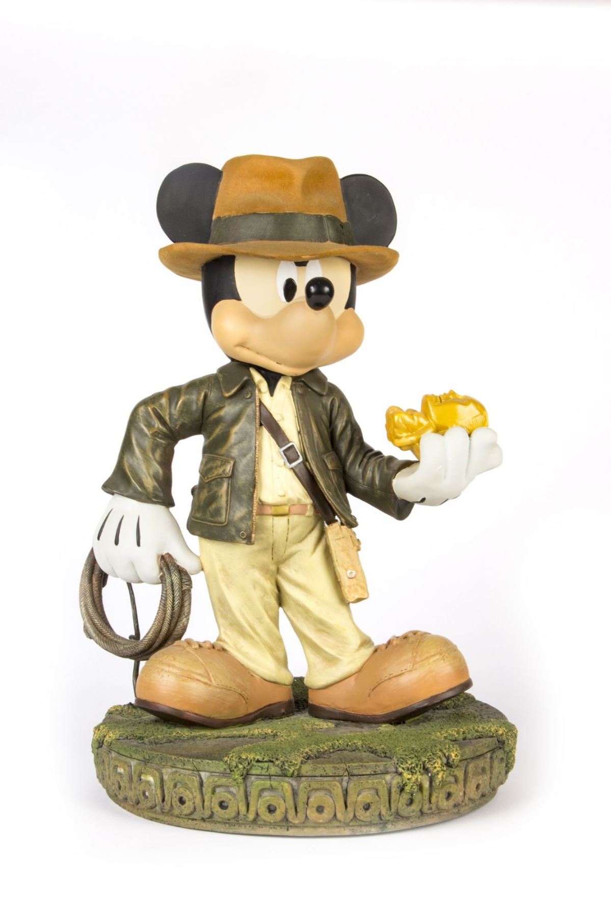 (Disneyland, 2009) A large limited edition statue of Mickey Mouse dressed as Indiana Jones. Created a part of the "The Art of Disney Theme Parks" series, this statue was limited to an edition of only 500. Beautifully sculpted by Costa Alavezos, the figure captures the essence of both Mickey Mouse and Indiana Jones. The figure is primarily created in resin, with a few other materials used to give the figure more of a life-like quality. Measuring approximately 18" tall, the statue is in very good condition with minor spots of wear from previous display.