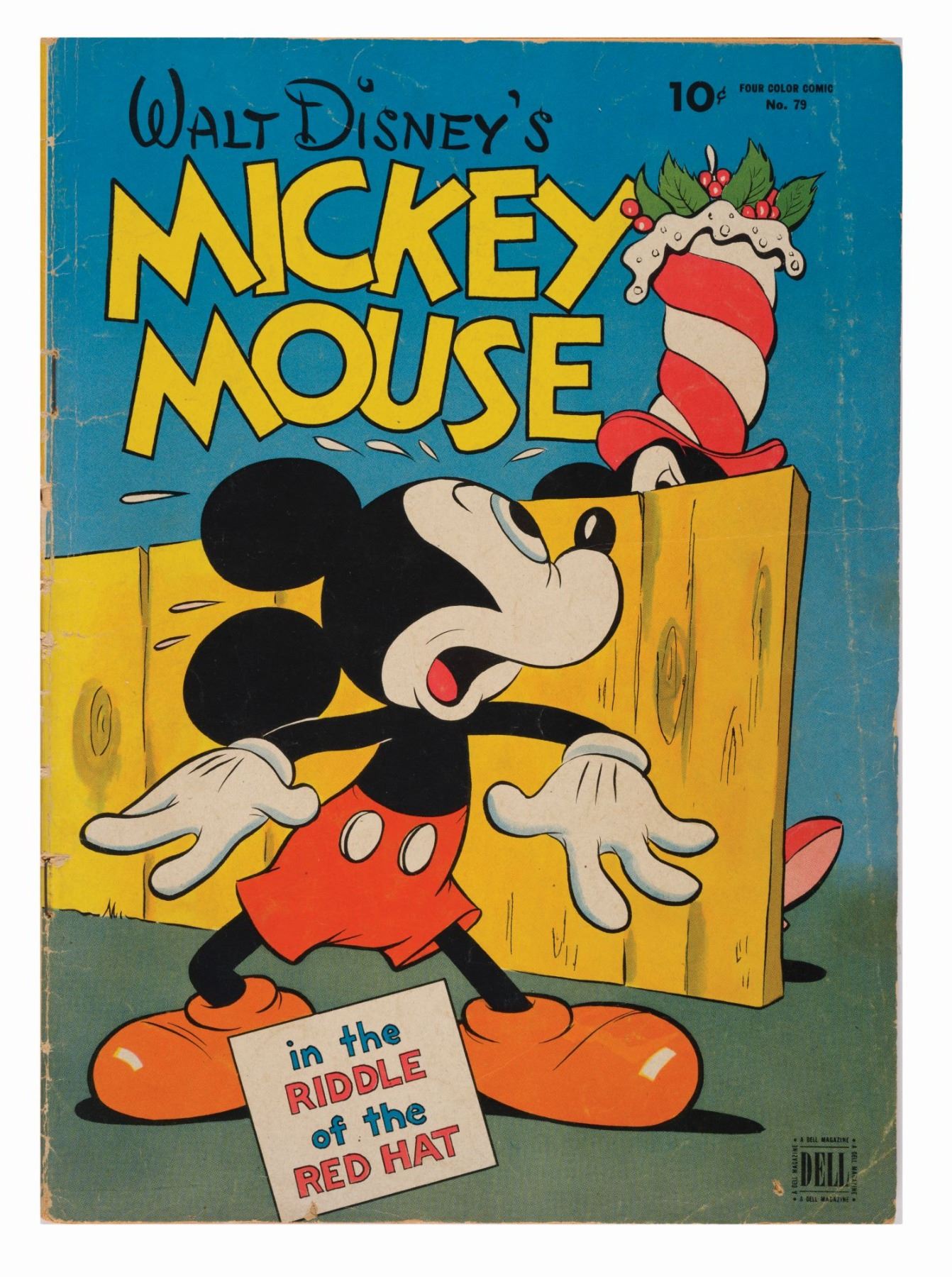 (Dell, 1945) A copy of "Walt Disney's Mickey Mouse in the Riddle of the Red Hat" no. 79. Measuring 7.25" x 10", the comic is in good condition, with edge wear, especially to the spine, and page discoloration from age.