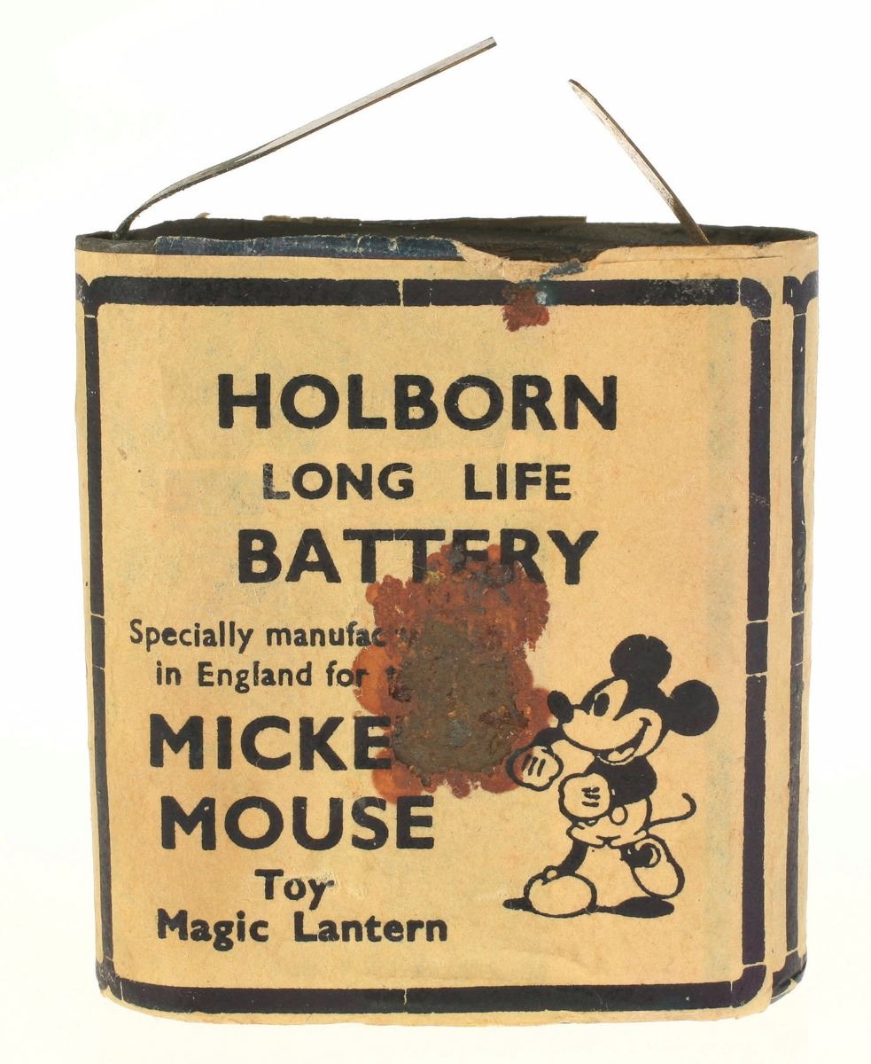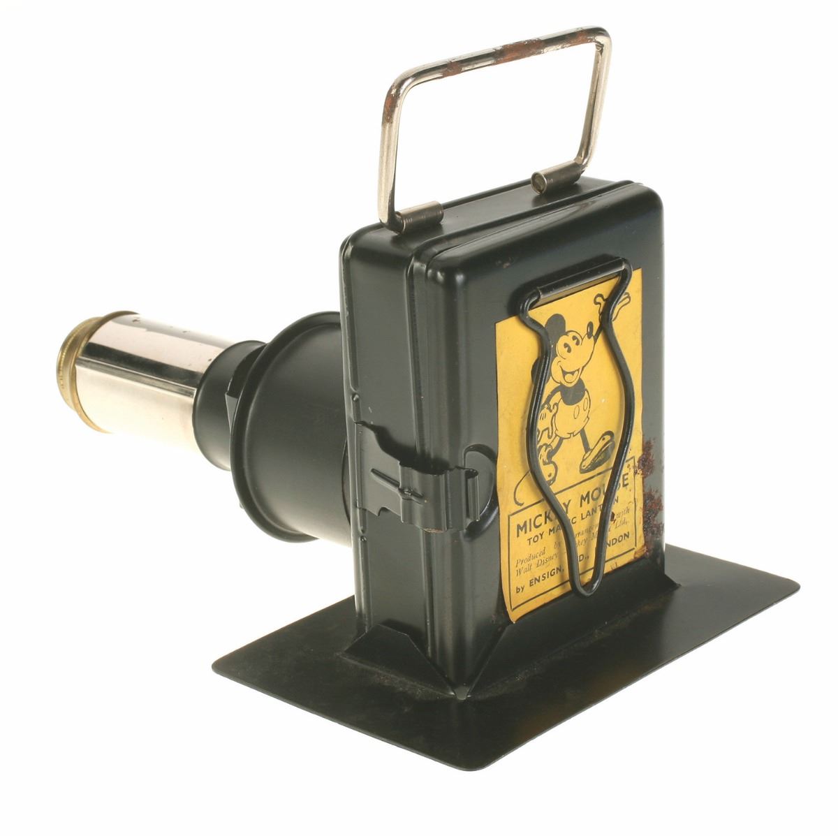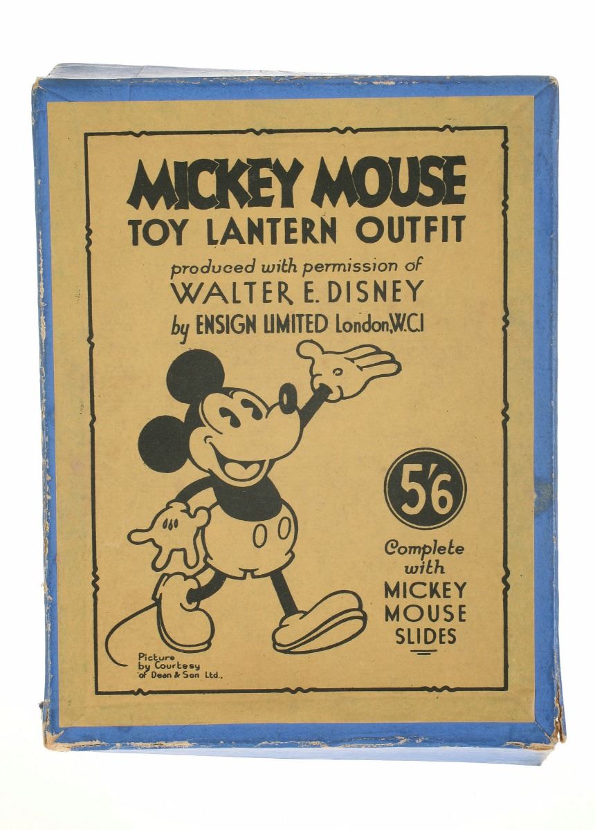 (Ensign, Ltd.) This "Mickey Mouse Toy Lantern Outfit" comes in its original box with a large pie-eyed Mickey on the surface. Lantern comes with the original lens, stand, and large unique battery which also features a Mickey. Does not come with slides. Box measures 6"x4.75"x3". In good condition, with some wear to the box and lantern, and some battery corrosion.