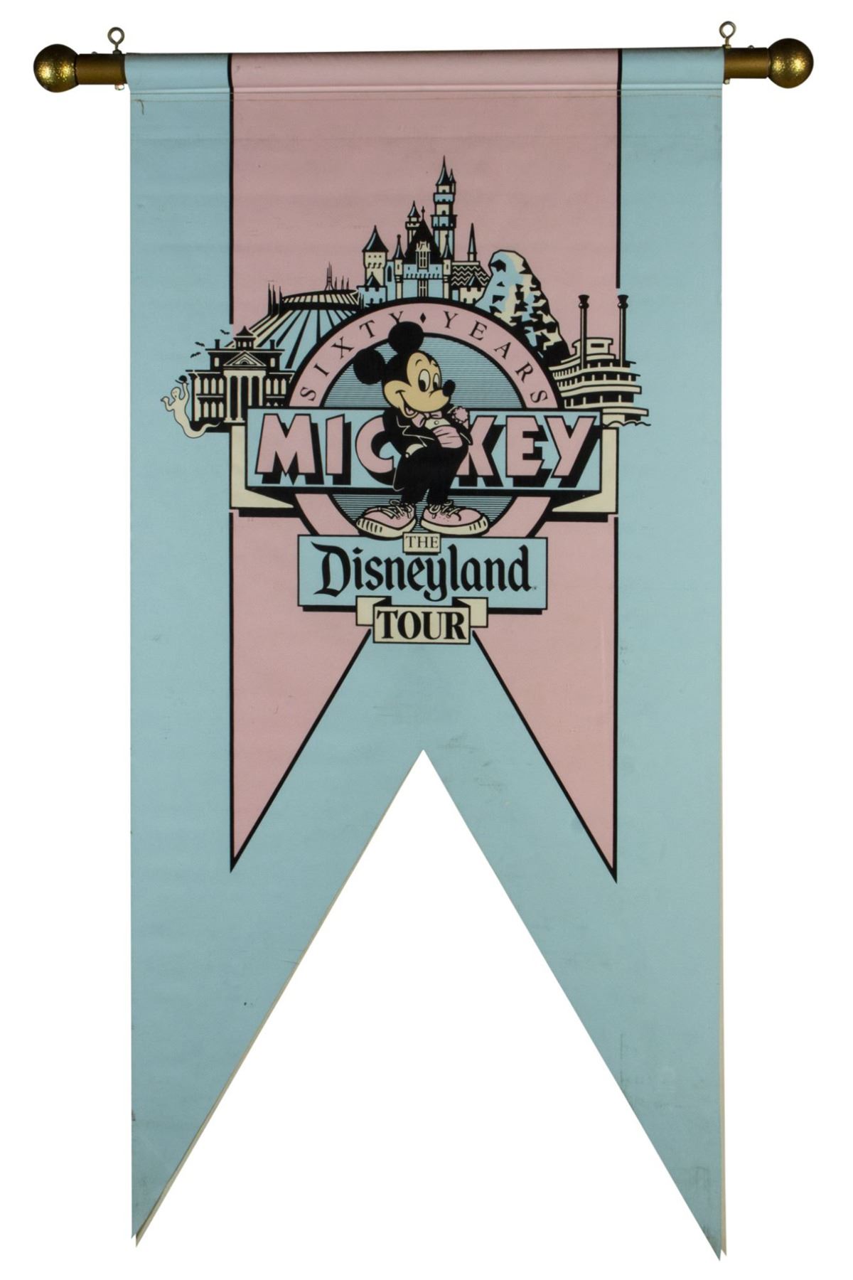 (Disneyland, 1988) A banner created for Mickey's 60th birthday celebration in 1988. This banner features great imagery of a well-dressed Mickey Mouse with several popular park attractions behind him. The double-sided banner measures approximately 50"x28" and is in good condition with some surface wear from use.