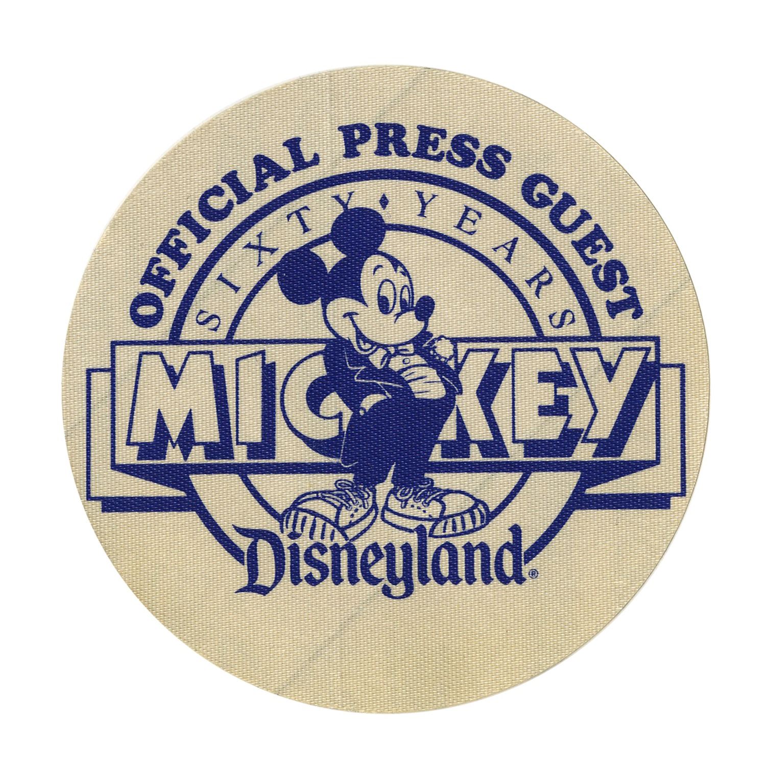 (Disneyland, 1988) A rare press badge created for Mickey's 60th birthday events at Disneyland. Featuring the logo for the anniversary with "Official Press Guest" written overhead, this fabric badge is unused with its adhesive backing still intact. Measuring 3.5" in diameter, the badge is in very good condition.