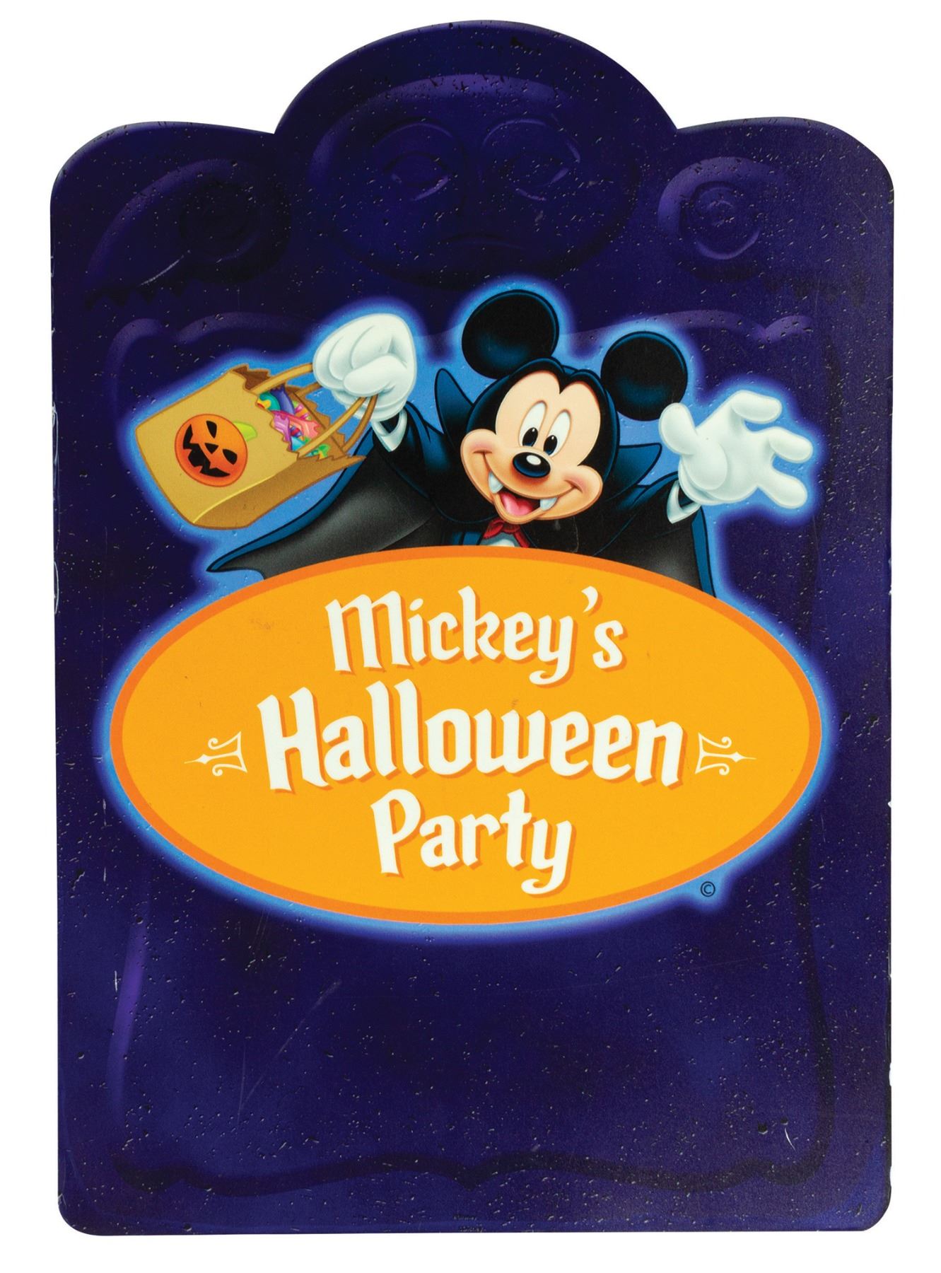(Disneyland, c.2017) A sign for Mickey's Halloween Party events at Disneyland. This popular seasonal event moved to California Adventure in recent years as "Oogie Boogie Bash." Printed on thin metal that is backed with dense foam, the single-sided sign measures 27"x19". The condition is fair with some creasing and wear around the edges. Some of the black coating on the reverse has peeled away, and there are several velcro tabs on the reverse from the signs original use.
