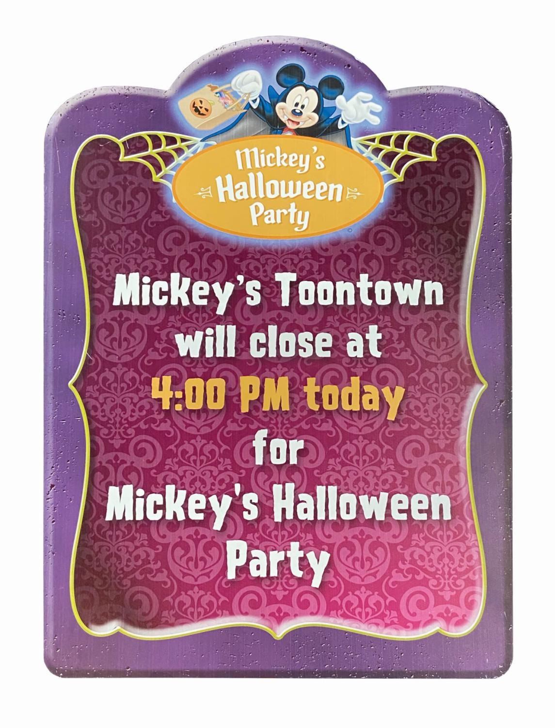 (Disneyland, c.2010s) A closure sign created for Mickey's Halloween Party. The sign announces that "Mickey's Toontown will close at 4:00 PM today," which was when party guests would occupy the area for early trick-or-treating and character meet-and-greets before the party took over the entire park. Printed on thin metal with a dense foam core, the sign measures 27.25"x20" and is in good condition. There is some surface and edge-wear consistent with use, including two spots exhibiting some bending at the upper right.