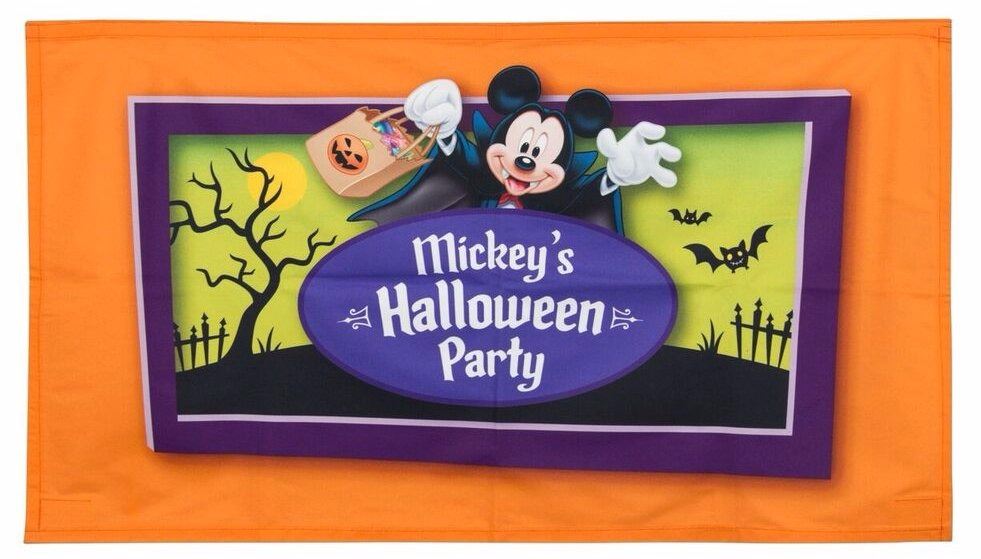 (Disneyland, c.2010) A banner created for Mickey's Halloween Party at Disneyland. This banner features a great image of Mickey dressed as a vampire and has the name of the event in large type. This banner was most likely displayed on the front of one of the "treat stop" carts during the event, and has a rough adhesive strip along the top-edge of the back of the banner for hanging. This item measures approximately 27"x48" and is in fine condition.