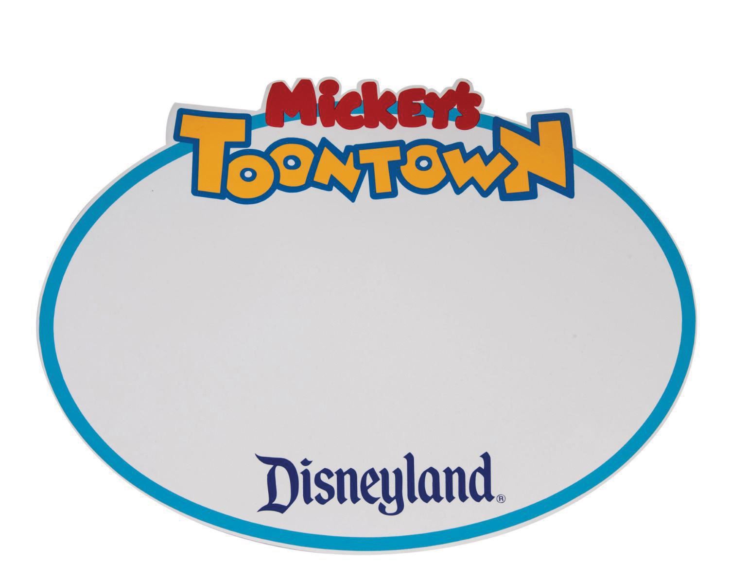 (Disneyland, c.2000s) A large magnetic vehicle sign from Mickey's Toontown. Resembling a Disneyland Cast Member name badge, the oversized magnetic sign was adhered to a vehicle to announce guests for parades and special events. Measuring 17"x23.75", the sign is in very good condition with little wear from original Park use.