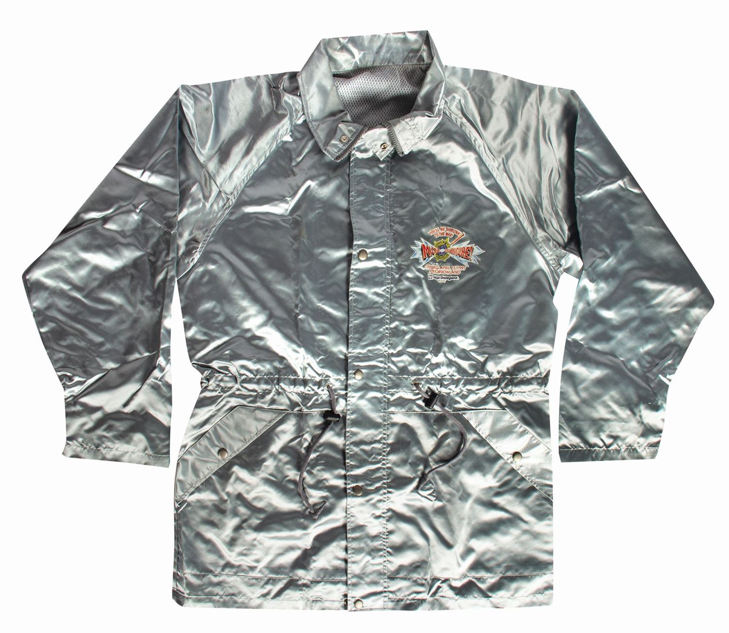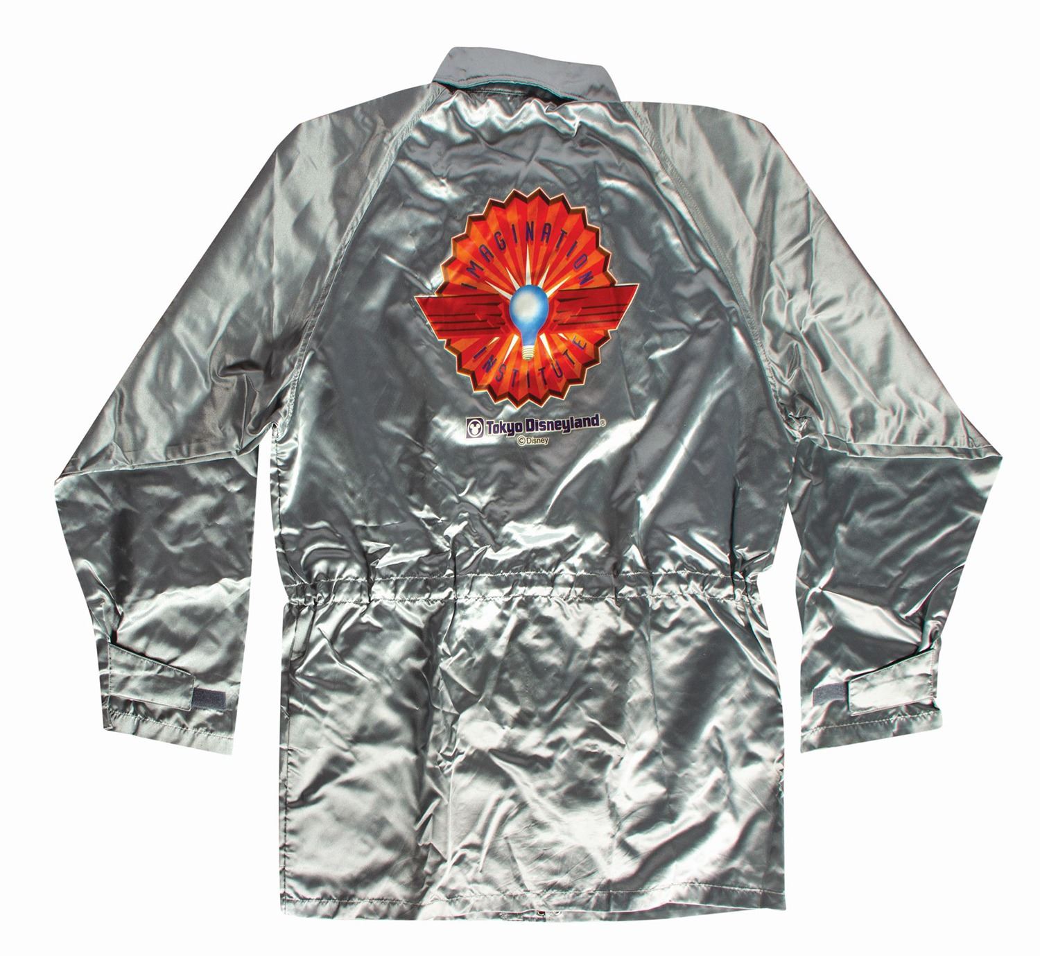 (Tokyo Disneyland, 1997) A rare pre-opening jacket given to members of the U.S.-based production team who contributed to the opening of MicroAdventure! in Tokyo Disneyland. The jacket comes in a metallic paper gift pouch and plastic bag that tells the project team that they are now "an honorary member of this Institute." The jacket is not marked for size but appears to be a size XL. The condition is good with several minor spots of soiling and wear to the sleeves and chest. There are creases and dents to the paper pouch.